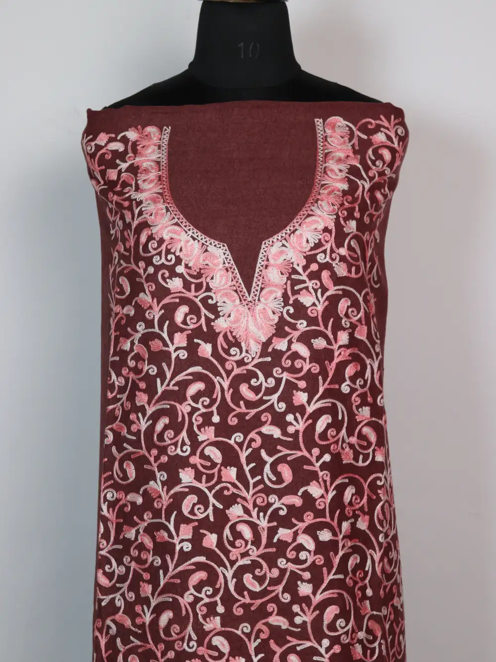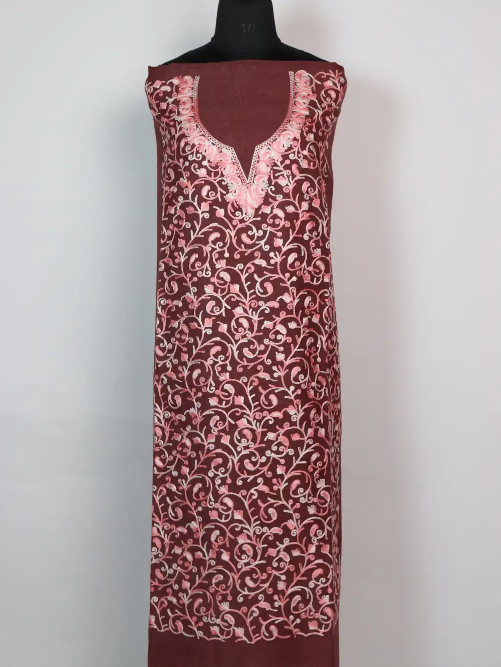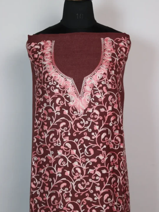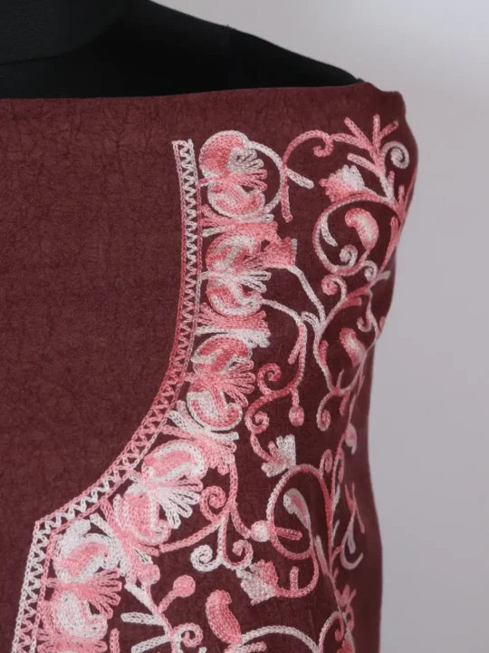 Crush cotton comes alive with pinkish jaal Aari floral motifs on this brown 2pc Suit, it is offered as unstitched fabric so you may stitch it to your preferred fit. It is light to the touch and easy to style, the 2pc Suit fits summer wardrobes well and appears often under cotton unstitched suits.