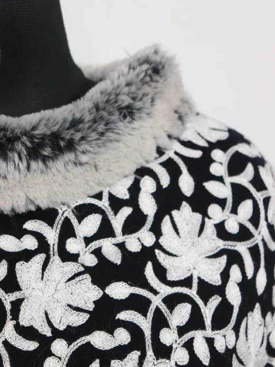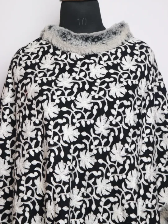 This fur poncho has elegant design with chinari aari work in an even jaal design that covers the entire body.