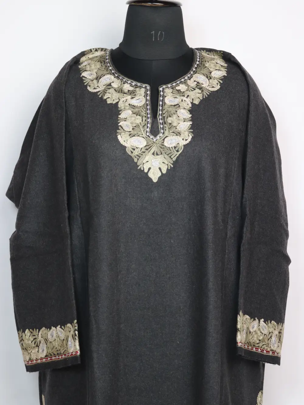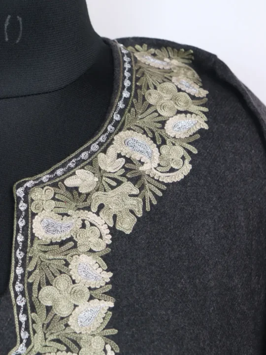 A practical dark grey phiran dress in tweed wool shows Aari and Zari badam and chinar patterns at the neckline and it includes pockets on both the sides for added ease. This phiran dress reads neat and wearable and keeps a small Kashmiri touch at the neck while remaining suitable for daily winter use.