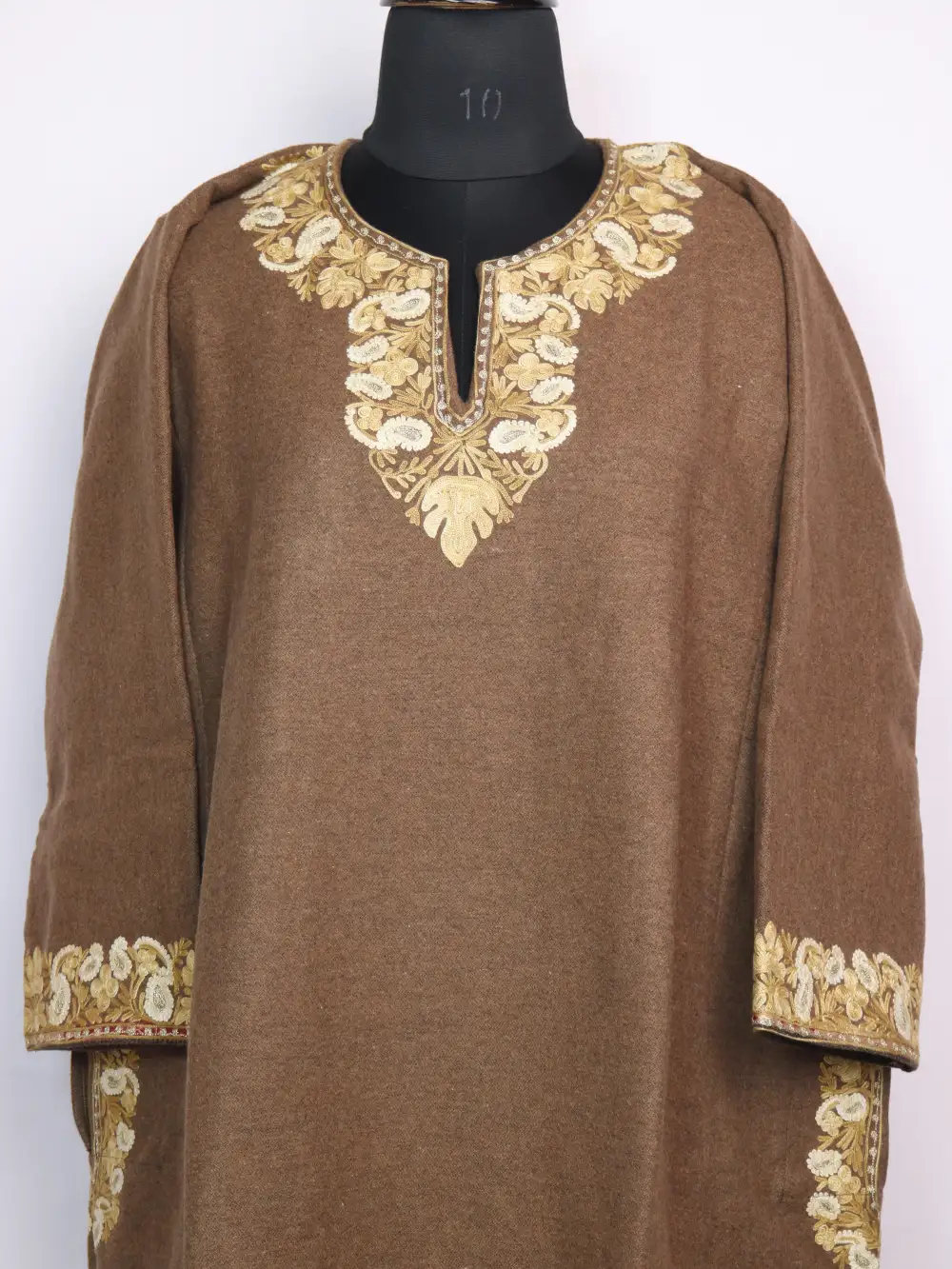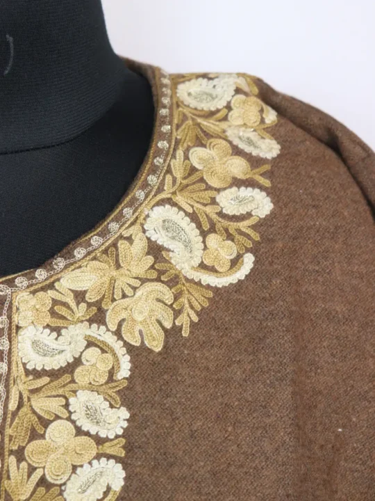Tweed wool lends structure to this light brown colour Kashmiri pheran with floral Aari and Zari embroidery at the neckline in badam and chinar patterns. Its chest size 54 inches and length 44 inches ensure comfortable layering.