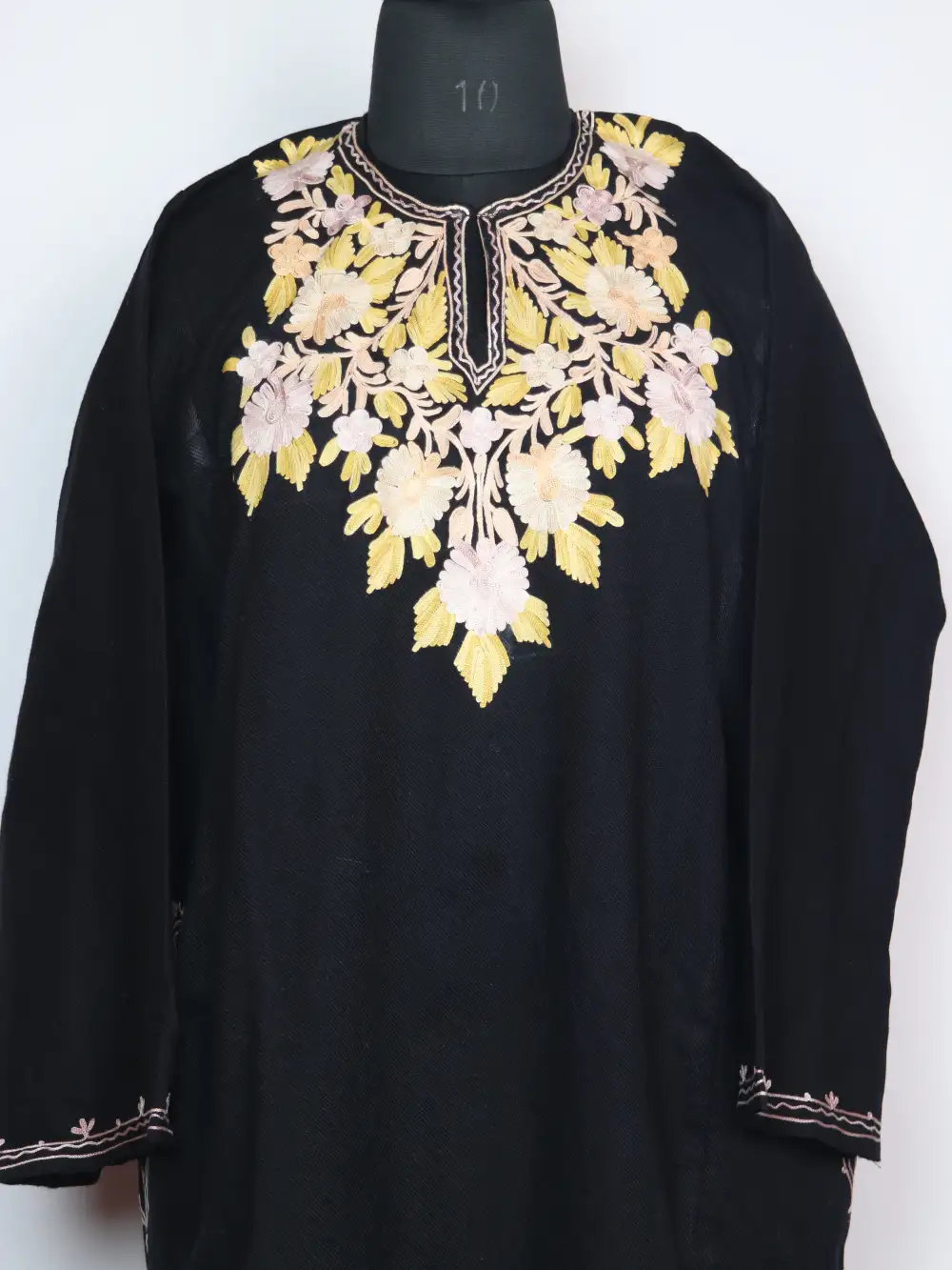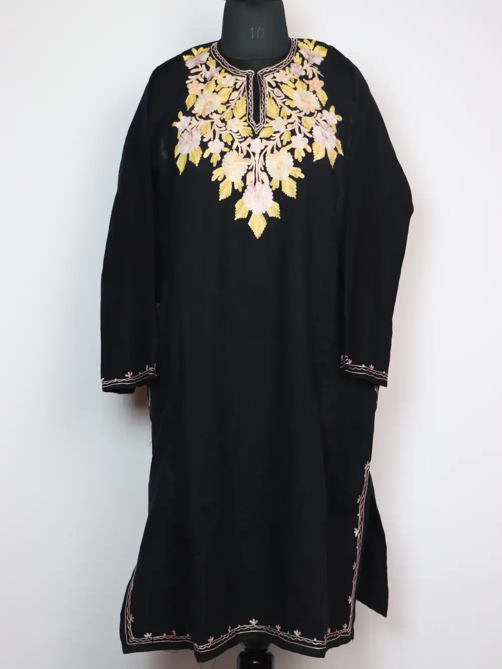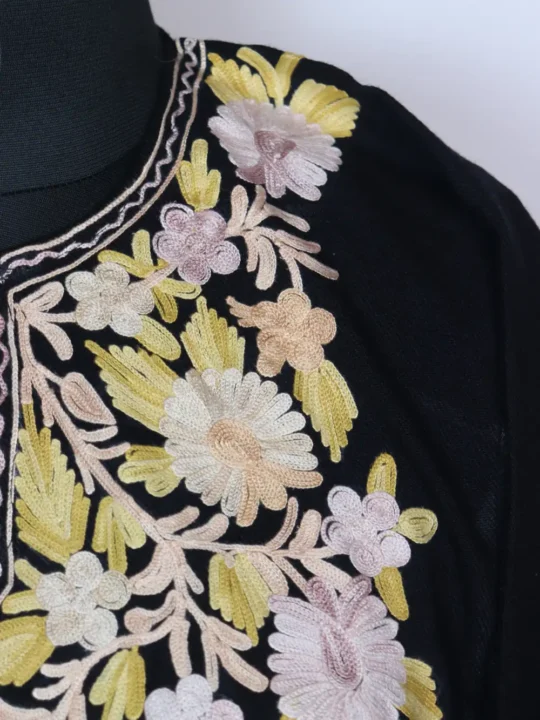 Rich Cashmilon wool composes this warm kashmiri phiran with floral aari work around neckline. The fabric stays warm and comfortable all day long.