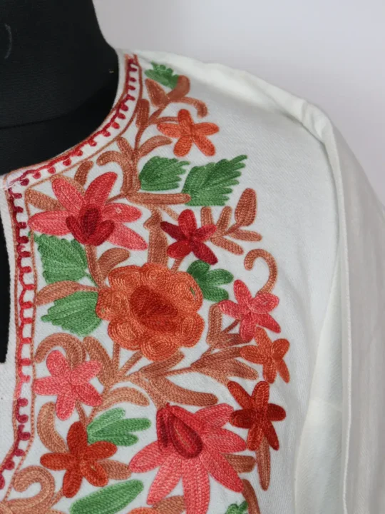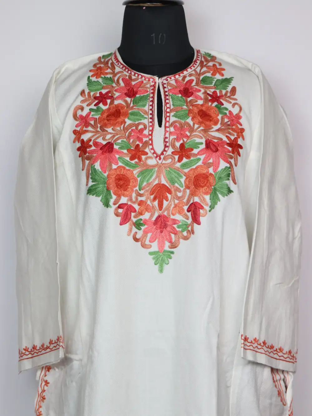 This cashmilon wool pheran shows detailed colorful floral Aari kadhai around the neckline, making it comfortable for everyday use.