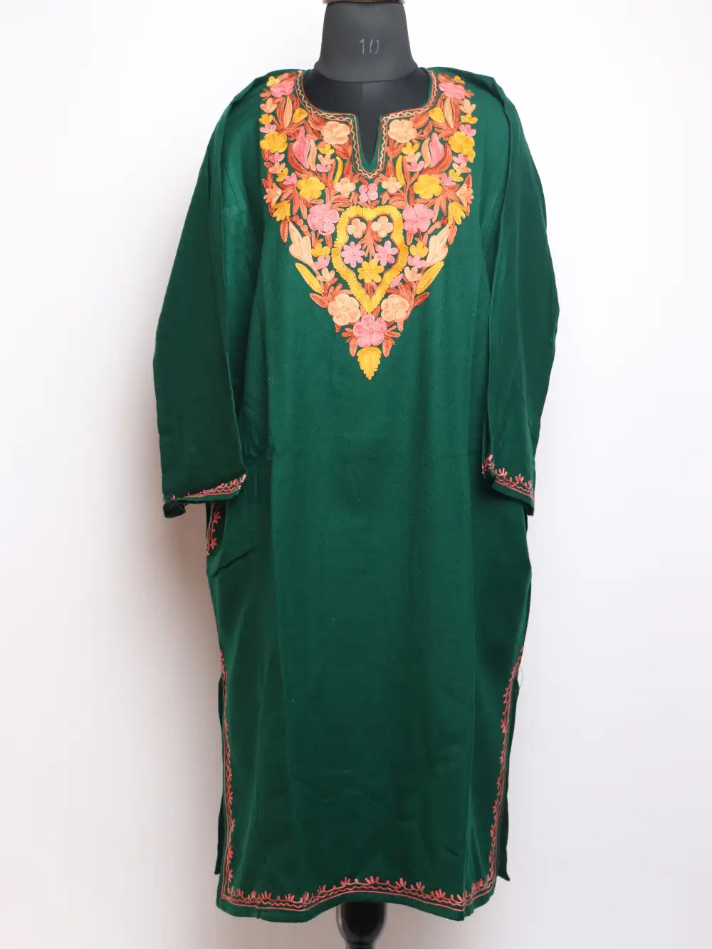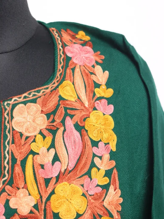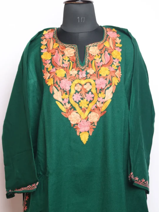 Refined Jashn-e-Rekhta phiran dress in green colour, woven in cashmilon wool, is detailed with Aari embroidery at the neckline in floral motifs.