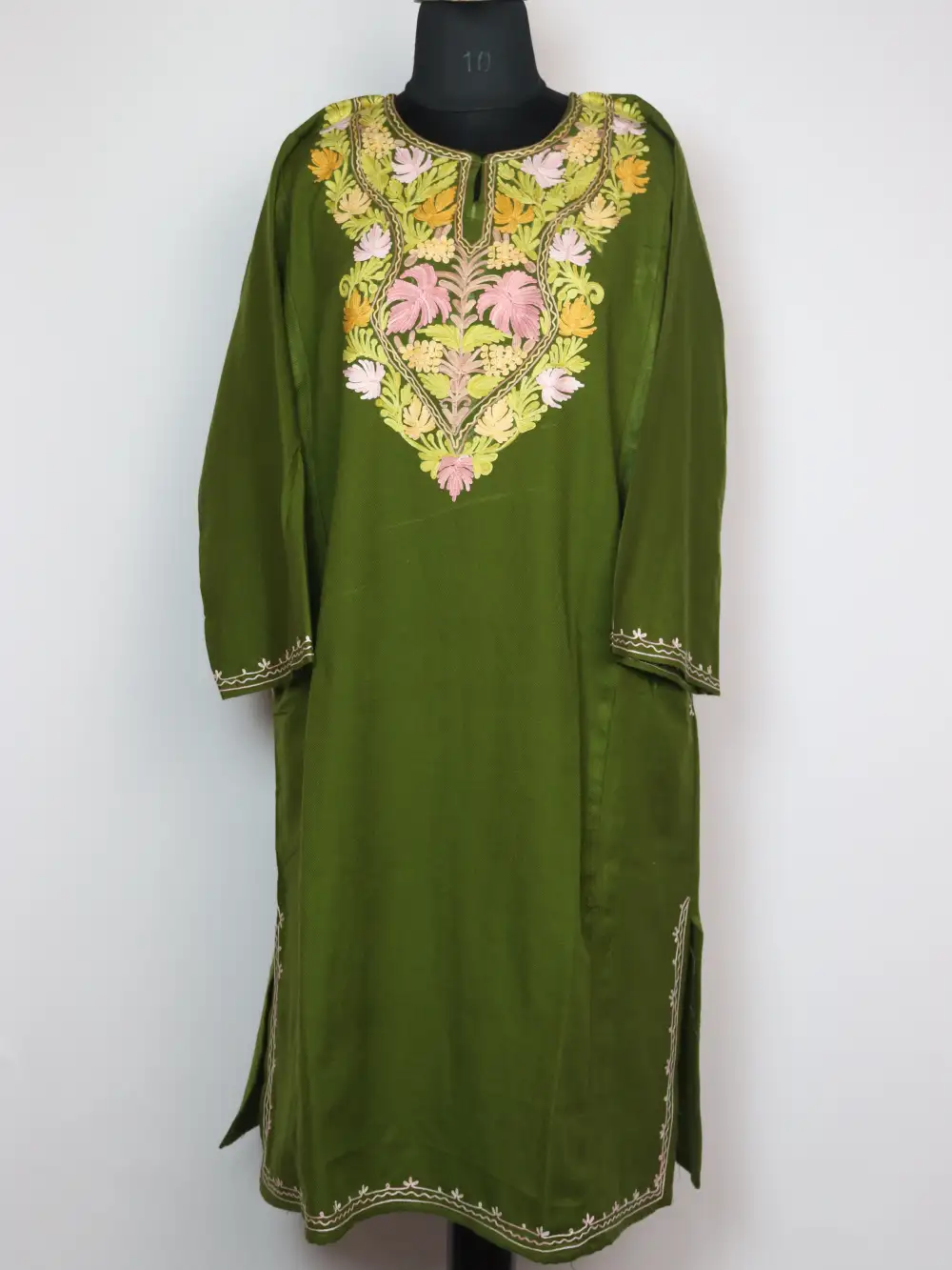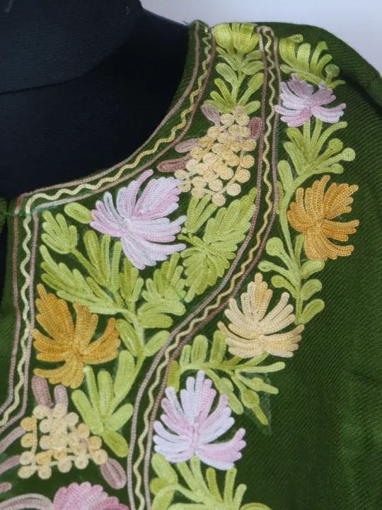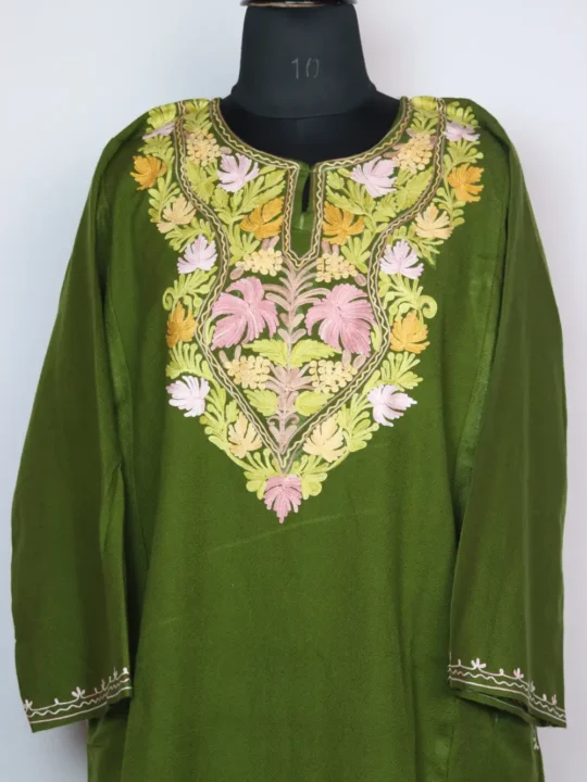 This Kashmiri firan features a floral and chinari embroidered Aari neckline that brings a soft cultural character to the Cashmilon wool.