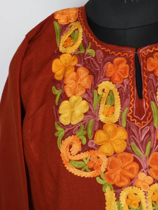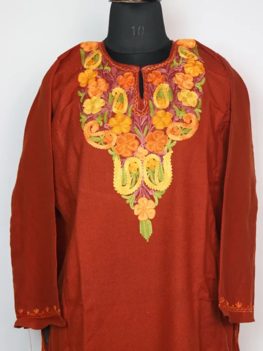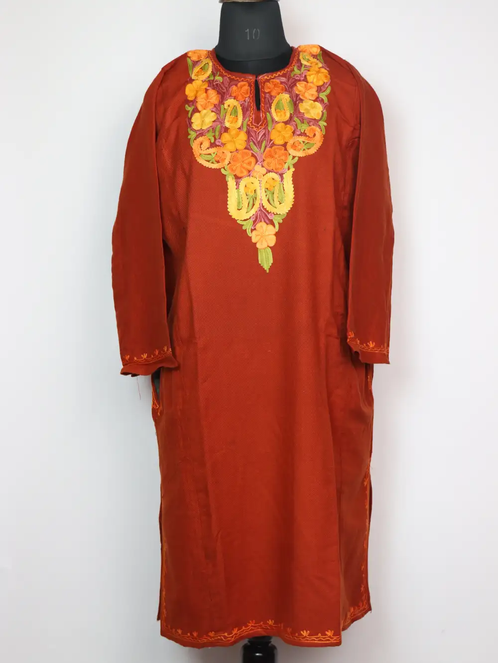 A perfect winter pick, this cashmilon pheran comes with floral and badam aari kadhai motifs around the neckline, adding a classic and charming detail.