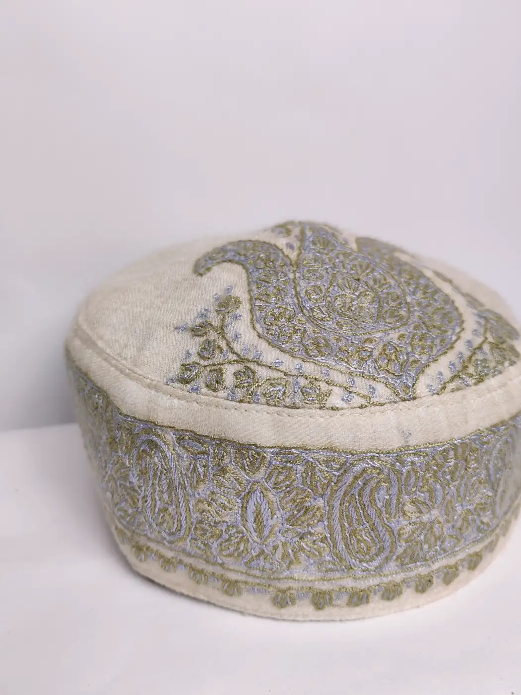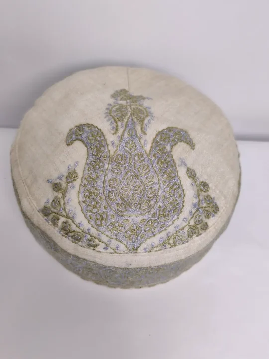 White MP pashmina forms the base of this stylish Kashmiri cap. It is enhanced with delicate hand sozni embroidery. The crown of this topi features a bold paisley motif while continuous badam patterns decorate the borders, giving it an elegant traditional look.
