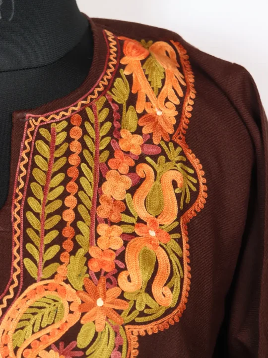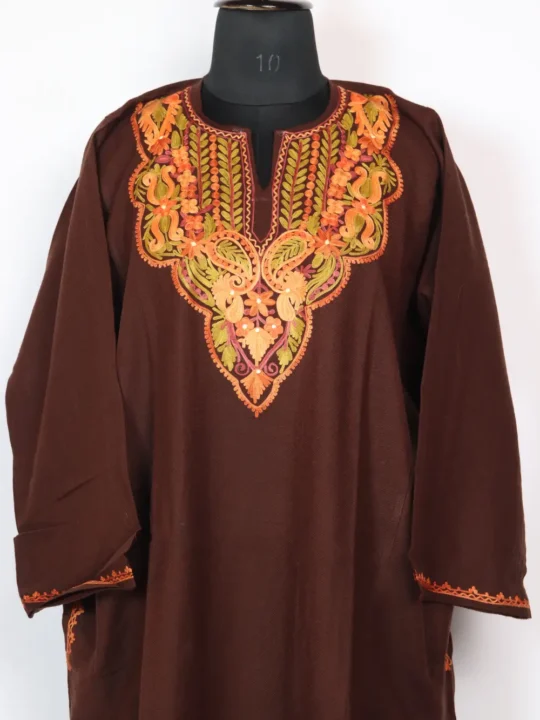 Among our curated pheran dress options, this dark brown Cashmilon wool Pheran stands out for its Aari embroidery in continuous badam and leaves patterns, done on its neckline. This pheran fits a 52 inch chest size and 42 inch length, it has pockets on both sides.