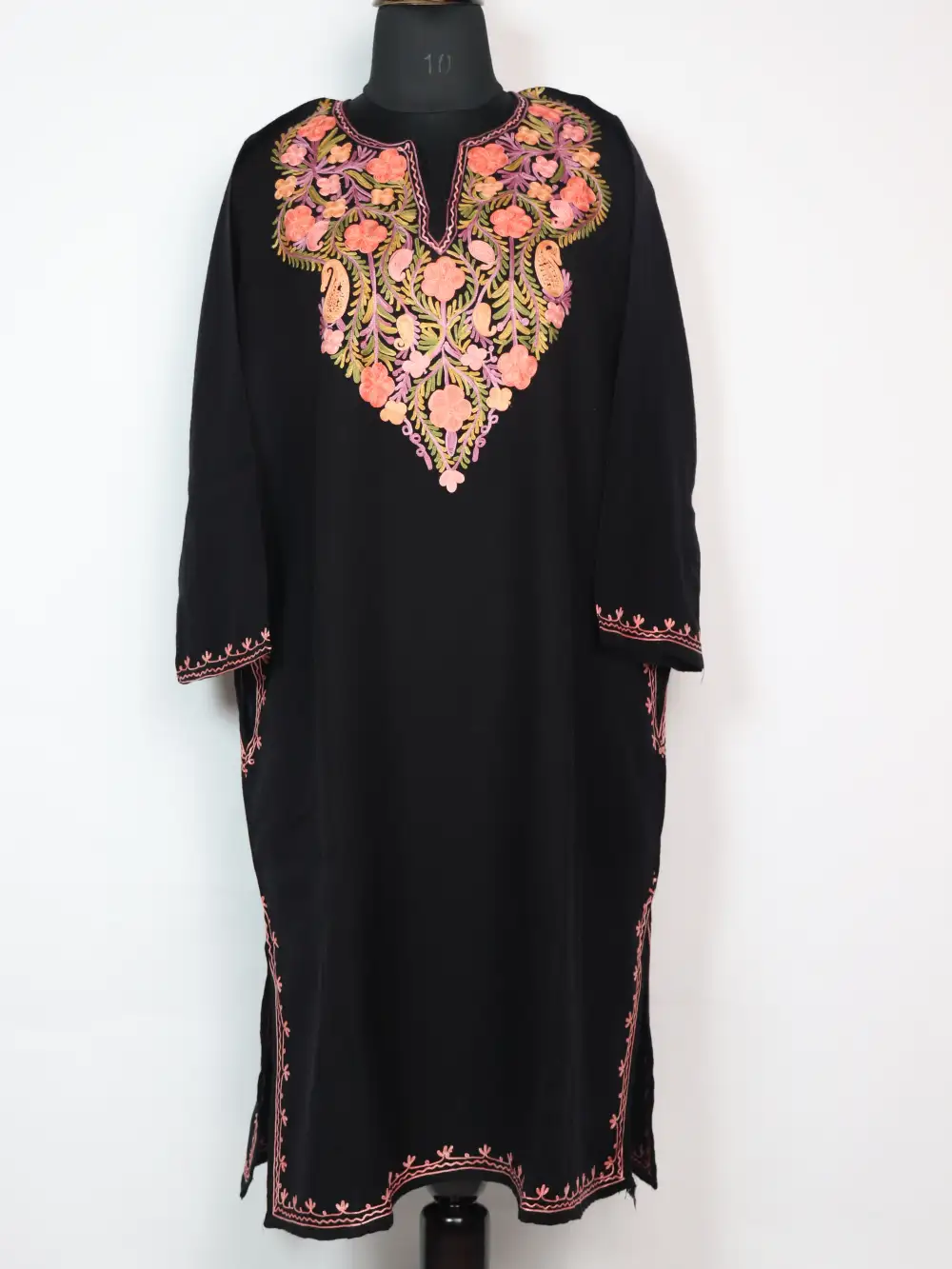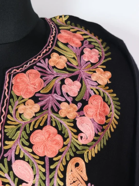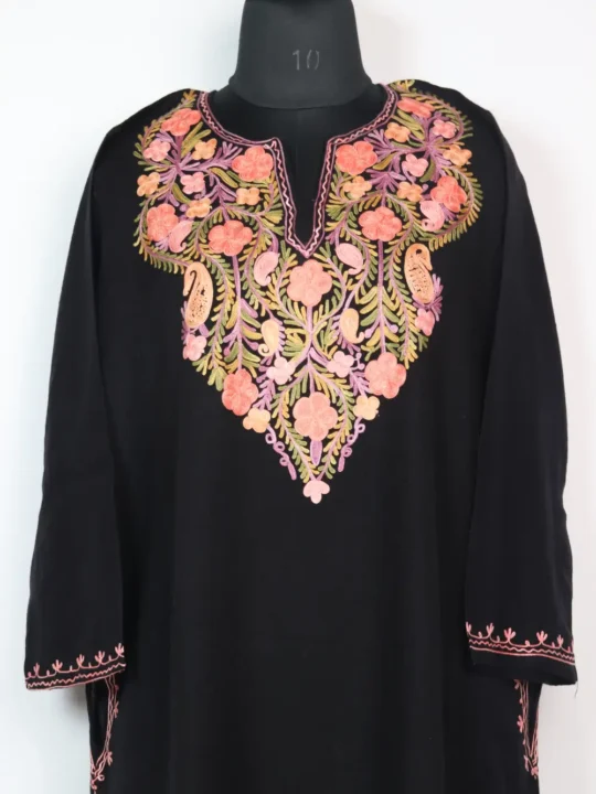 This cashmilon wool Pheran presents rich Aari work in leafy and floral patterns which are stitched around the neckline. It comes with chest size 50 inches and length 44 that ensure relaxed fit.