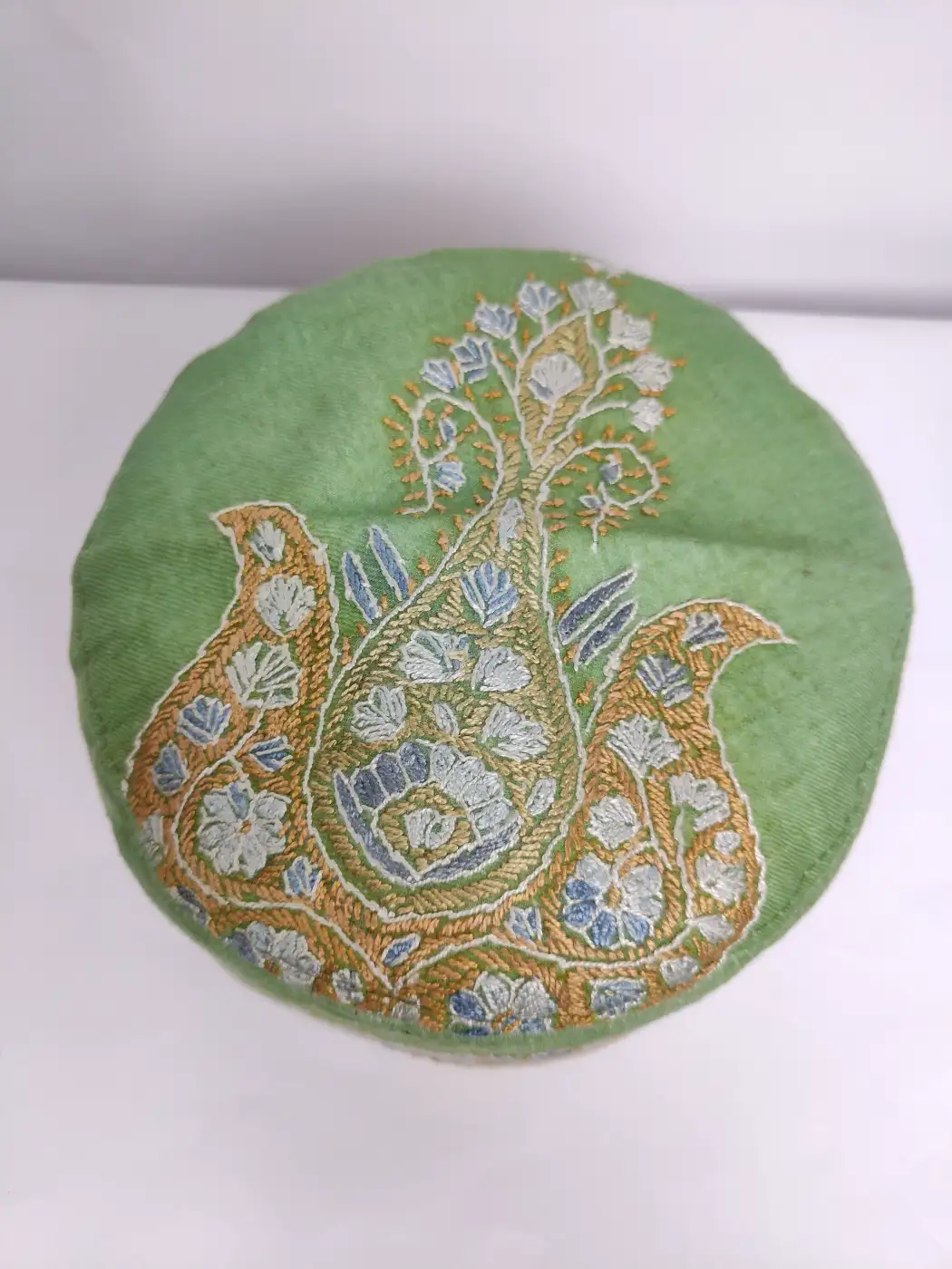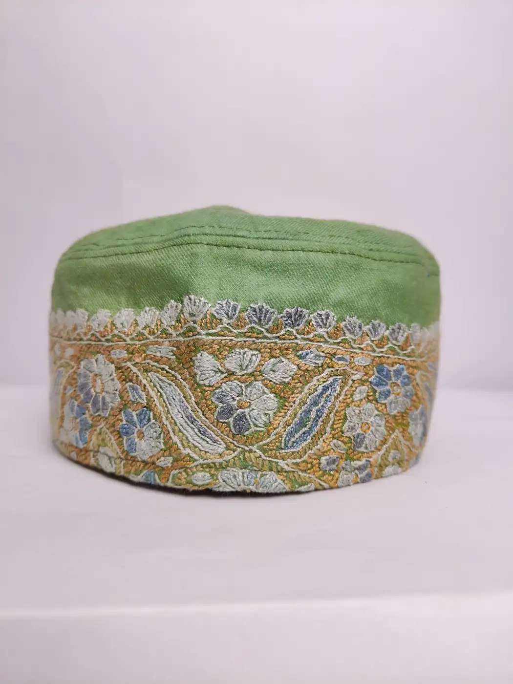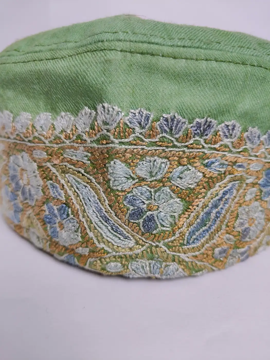 Intricate hand sozni embroidery enhances this handmade Kashmiri cap. It is crafted from white MP pashmina. This topi features prominent paisley motif which decorates the crown while continuous badam motifs line the borders.