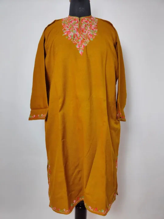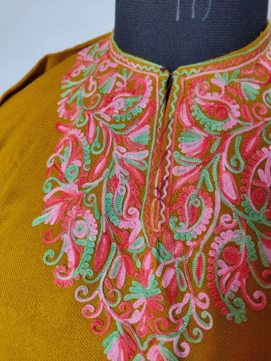 This yellow Cashmilon pheran, 40 inches in length, offers cosy warmth with a refined touch. Red-green floral aari embroidery adorns its neckline, which creates a soft contrast against the cheerful tone. It is lightweight and easy to wear, it’s ideal for casual winter styling. At ₹1299, it’s an affordable choice for those who want comfort blended with graceful detail.