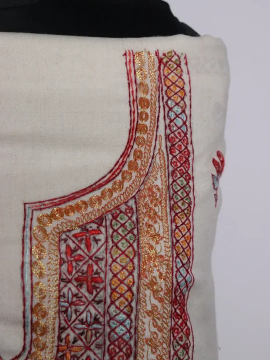 Prepared in polywool to retain warmth, this Kashmiri suits for winter come in white colour. This Kashmiri 3pc unstitched ensemble includes kameez, salwar and dupatta. It carry hand sozni and tilla floral neckline and booti embroidery.