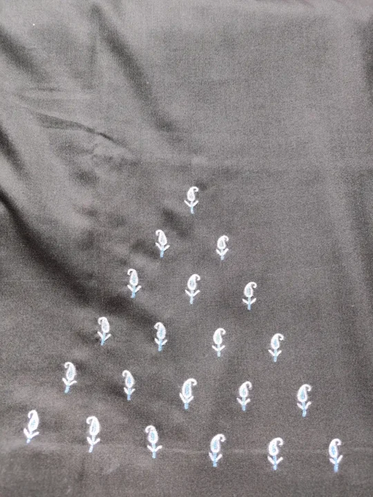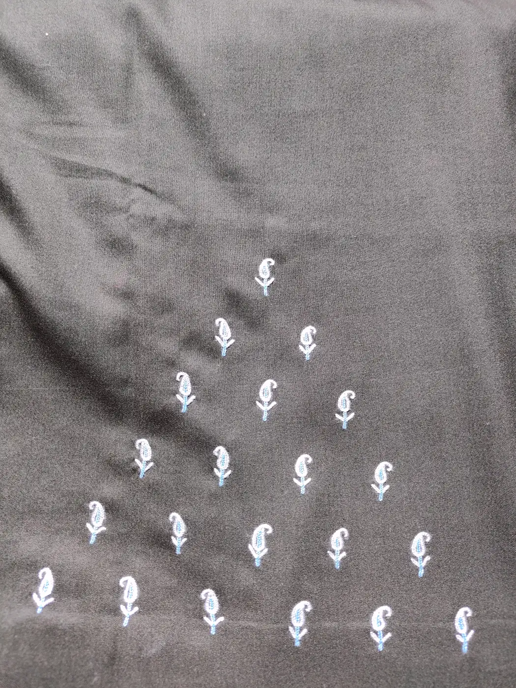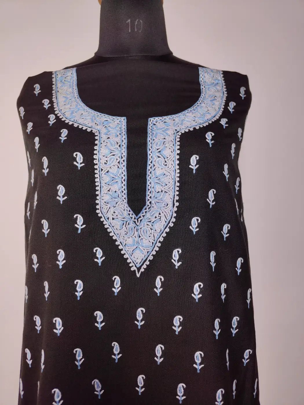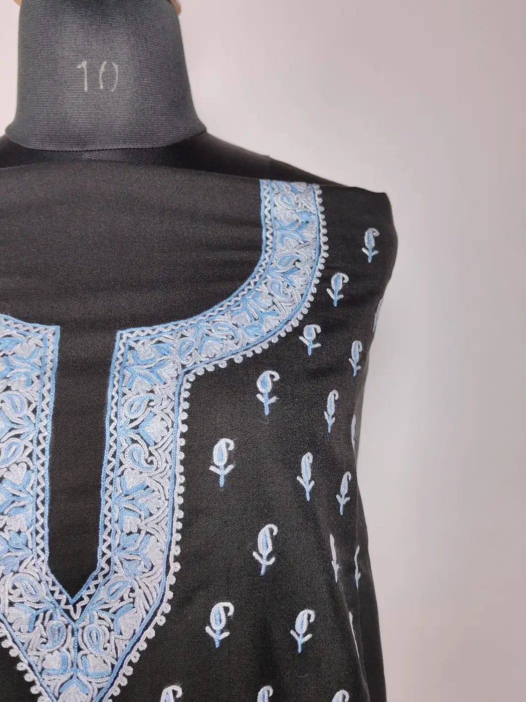Floral detailing at the neckline, while bootis aprea across the fabric adds a graceful touch to this Kashmiri embroidery suit piece. This black summer cool cotton base keeps it refined and easy to wear. As an unstitched 2pc salwar kameez, it allows complete flexibility in stitching and styling.