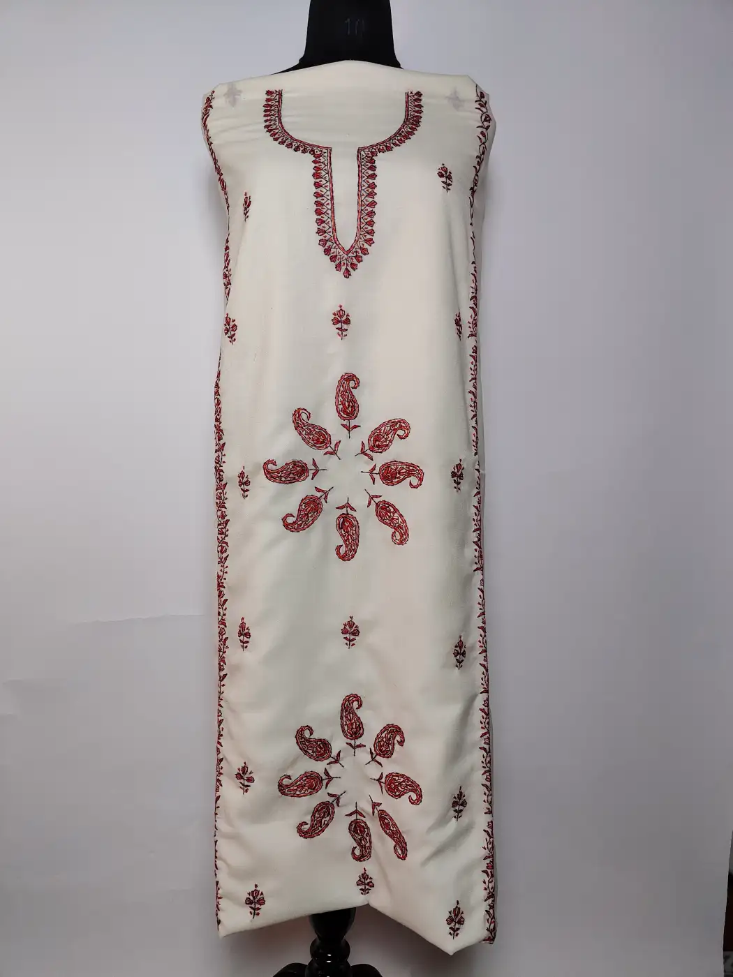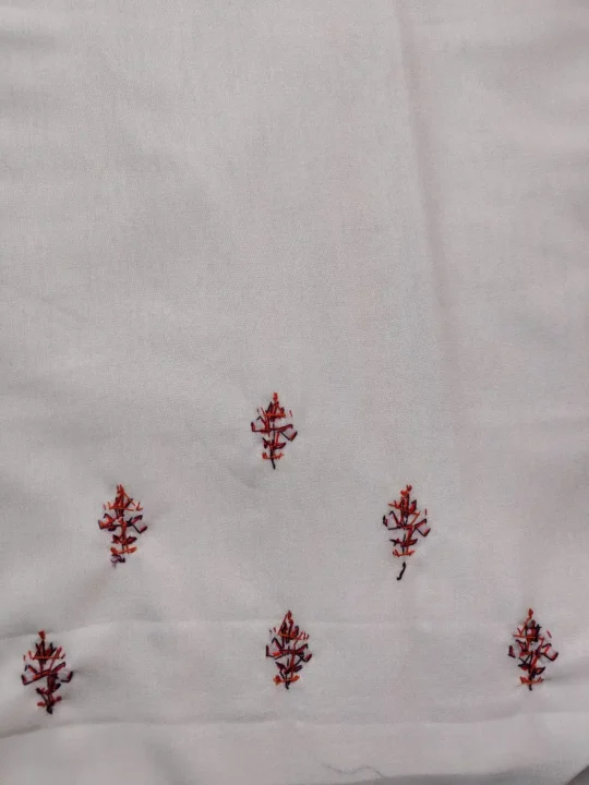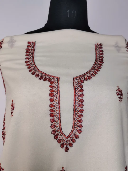 Rooted in tradition, this traditional Kashmiri suit design features floral hand sozni embroidery placed neatly along the neckline and in round pattern spread at front panel. Crafted in cream summer cool cotton, this unstitched salwar kameez set lets you customise the fit while keeping the look classic and composed.