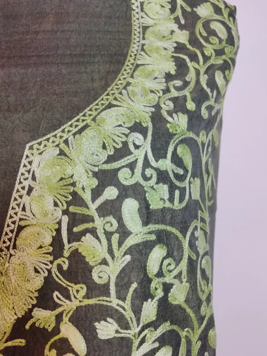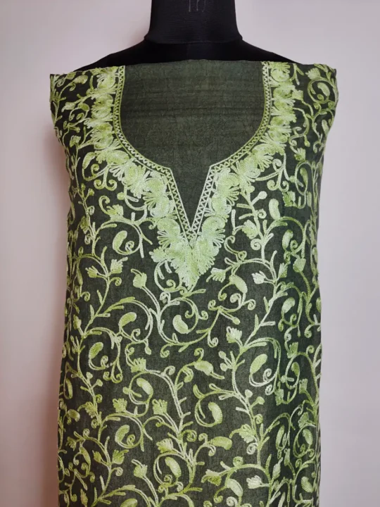 Made from Green crush cotton, this Kashmiri kadhai suit highlights Kashmiri aari embroidery in all over badam jaal style. This kashmiri cotton ustitchedsuit includes kurti and trouser so you can tailor the fit for charming daily wear with comfort and breathability.