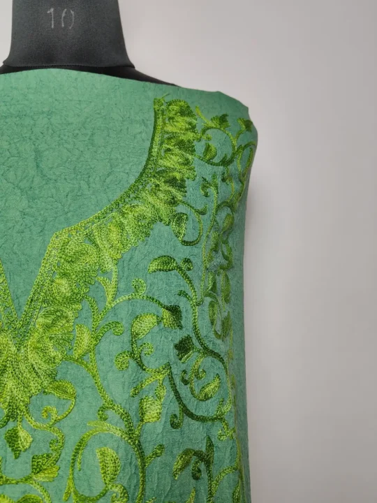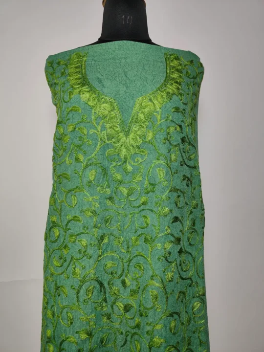 This kashmiri embroidery suit design stands out with its evenly spread badami jaal embroidery across the teal green base. The aari work feels light yet detailed. It includes unstitched salwar and kameez, makes it easy to customise while keeping a traditional look.