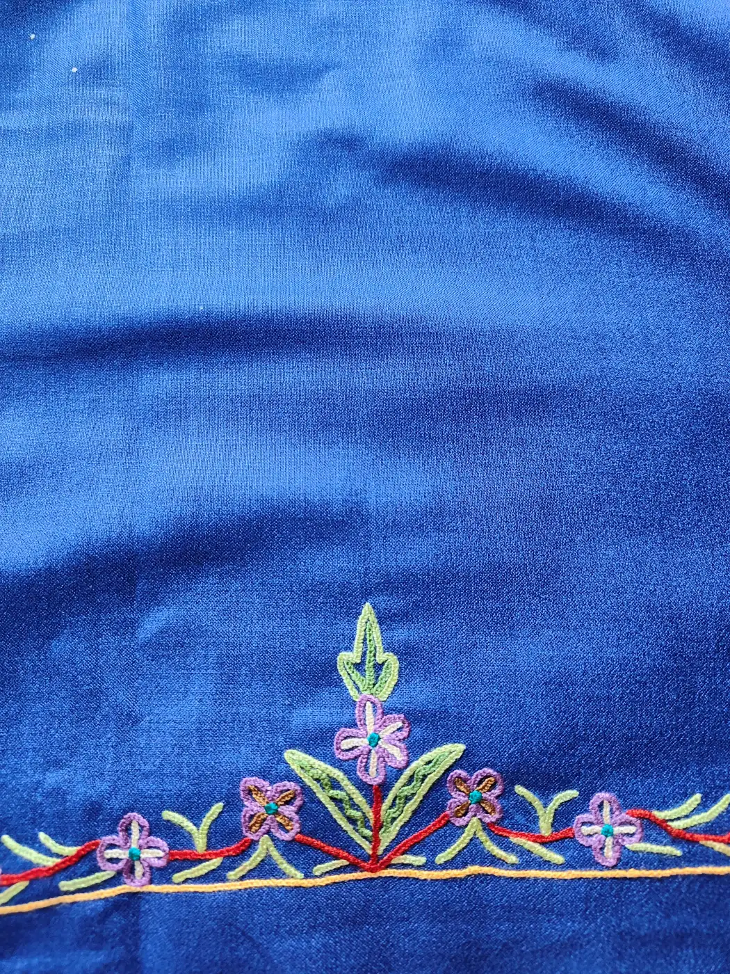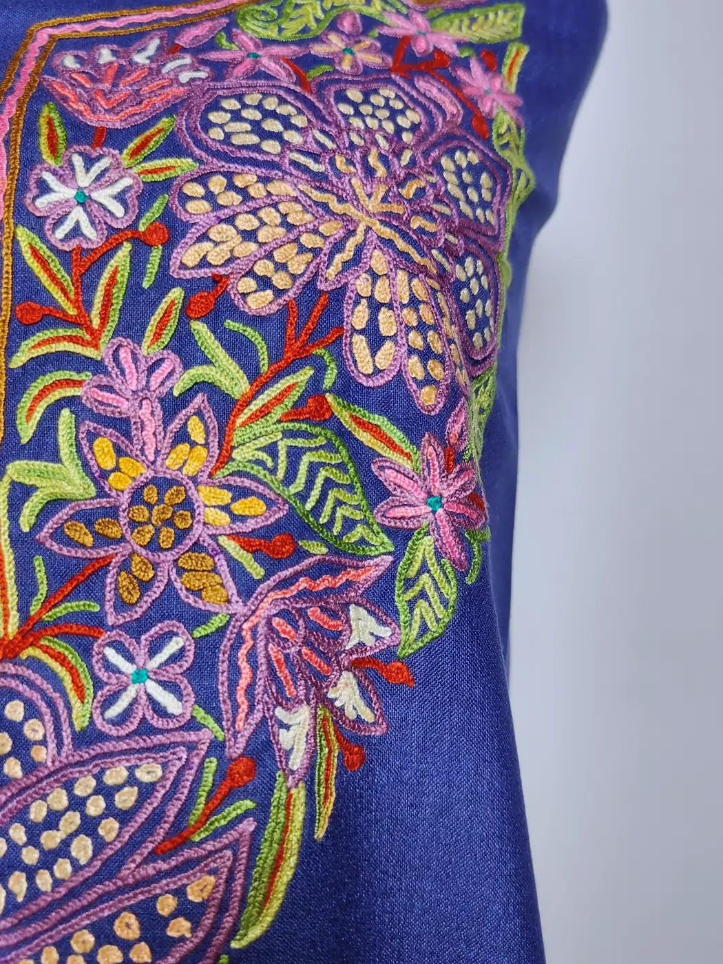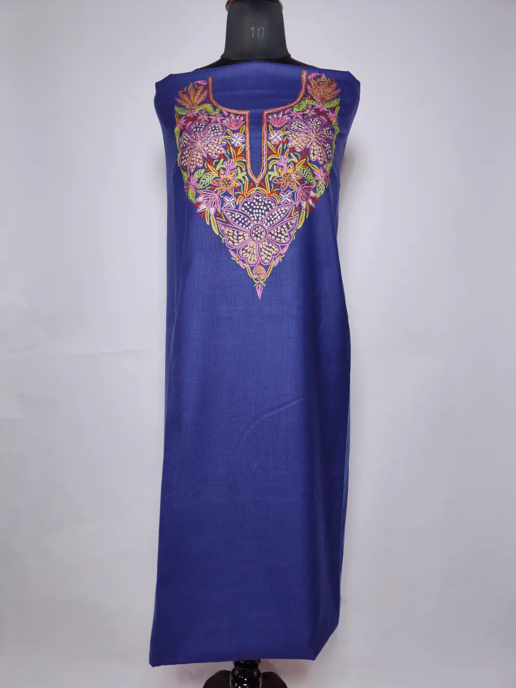 Crafted in smooth dark blue ruby cotton, this Kashmiri embroidery suit feature floral aari work at the neckline. The hand aari work against dark blue base keeps the look elegant and easy to carry. With unstitched kurti and trouser included, it allows you to shape the outfit as you like.