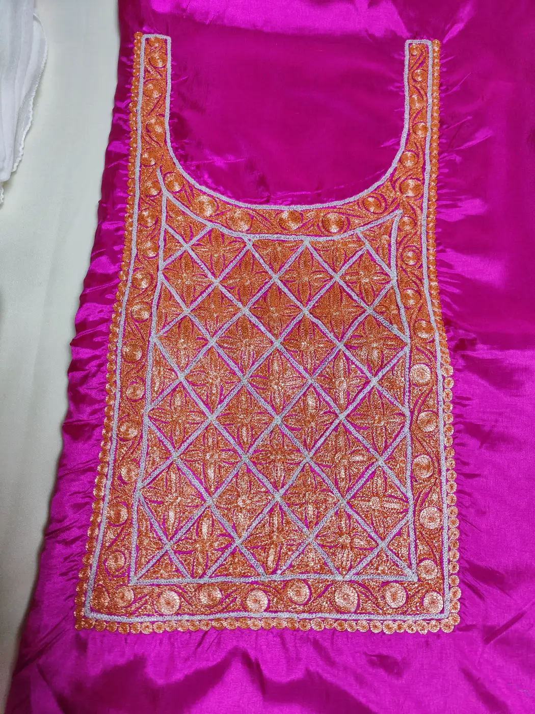 Balanced in contrast, this kashmiri kadhai suit pairs a magenta kameez with white salwar and dupatta. The neckline carries geometrical botte tilla embroidery, while the dupatta features line work along the borders. It is a 3pc unstitched set for custom stitching.