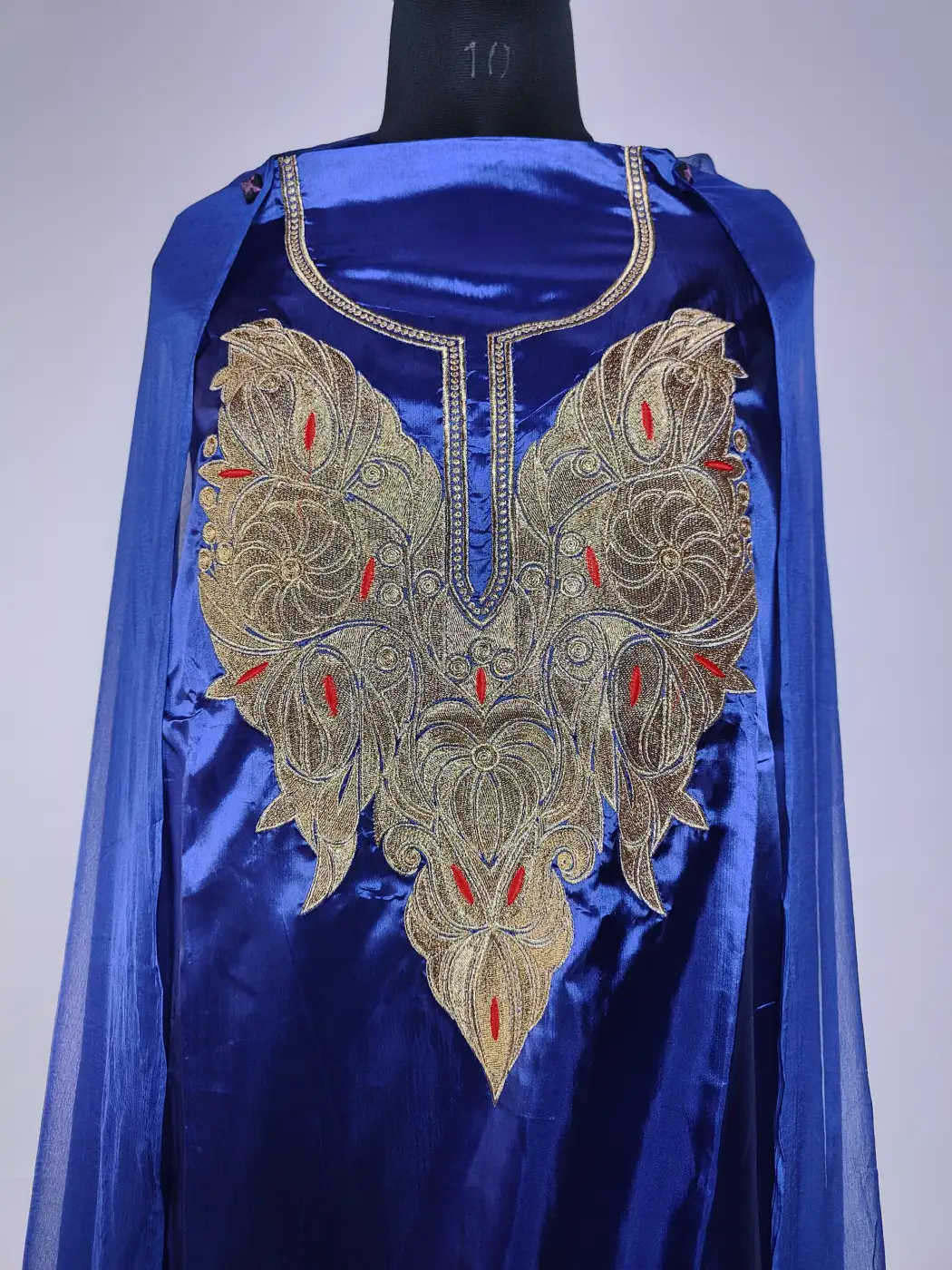 This 3pc kashmiri salwar suit is designed in navy blue silk with zari embroidery. The neckline carries fine work which enhance the elegance.It comes as an unstitched set of salwar, kameez and dupatta.