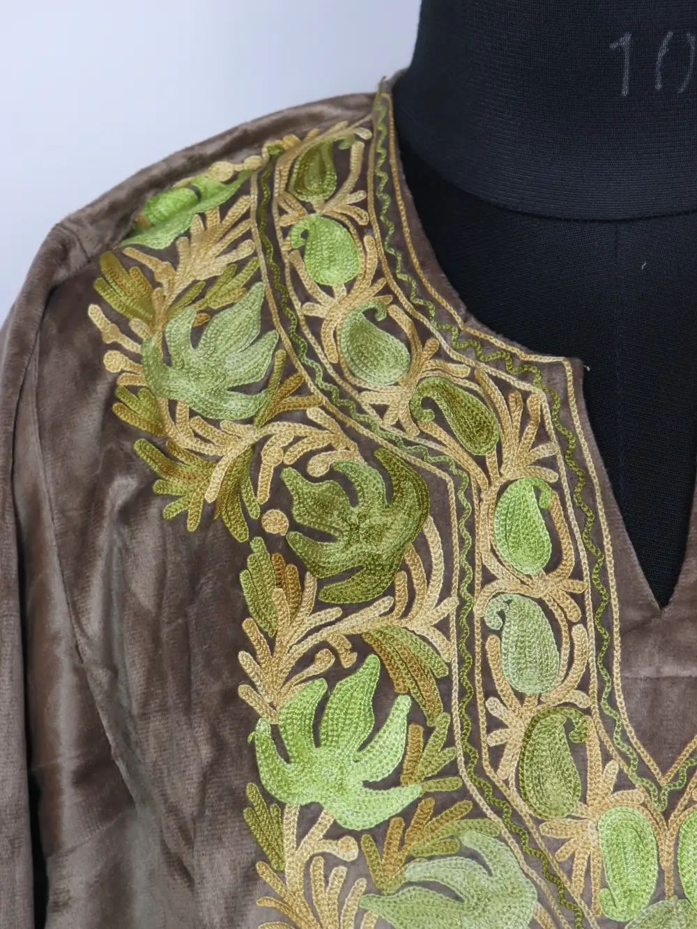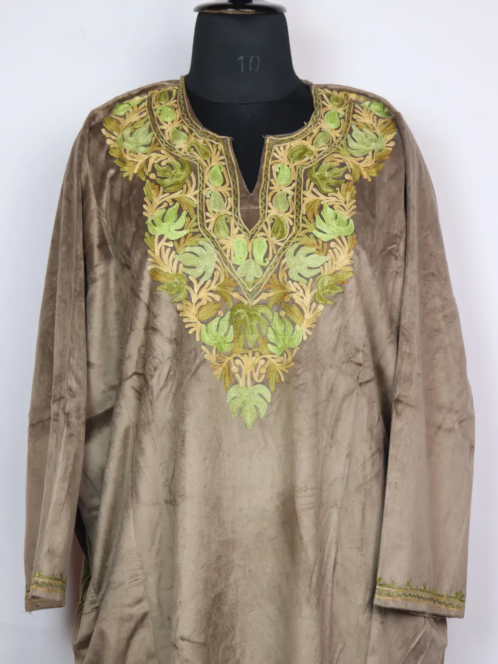 Made with velvet that feels warm and elegant, this pheran is easy to wear. The neck features aari badam and chinari detail, and its 58 chest with 45 length gives a relaxed fit.