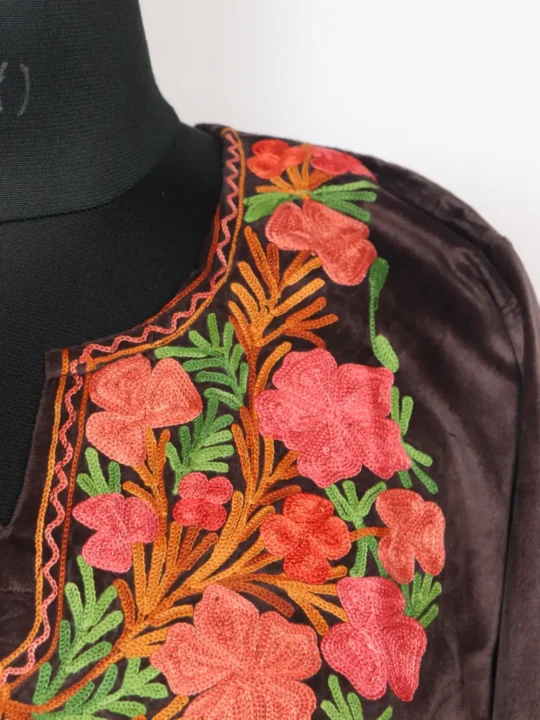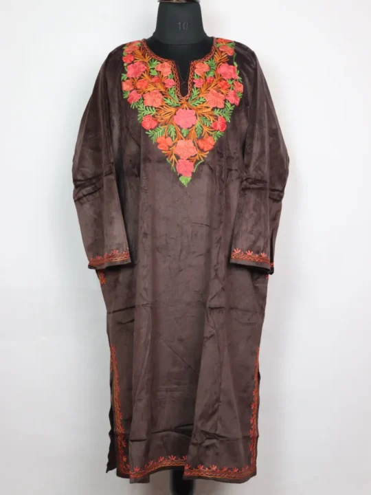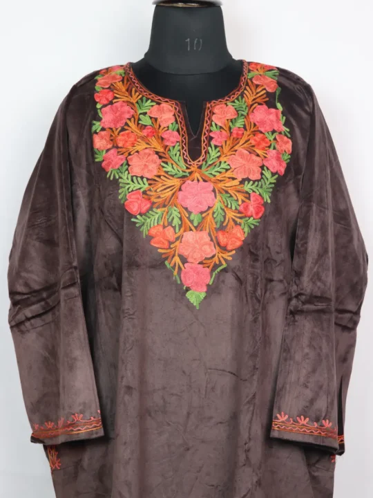 Made with velvet that feels warm and elegant, this pheran is easy to wear. The features include colorful kadhai floral work around neckline, having two side pockets which adds to its practicality.
