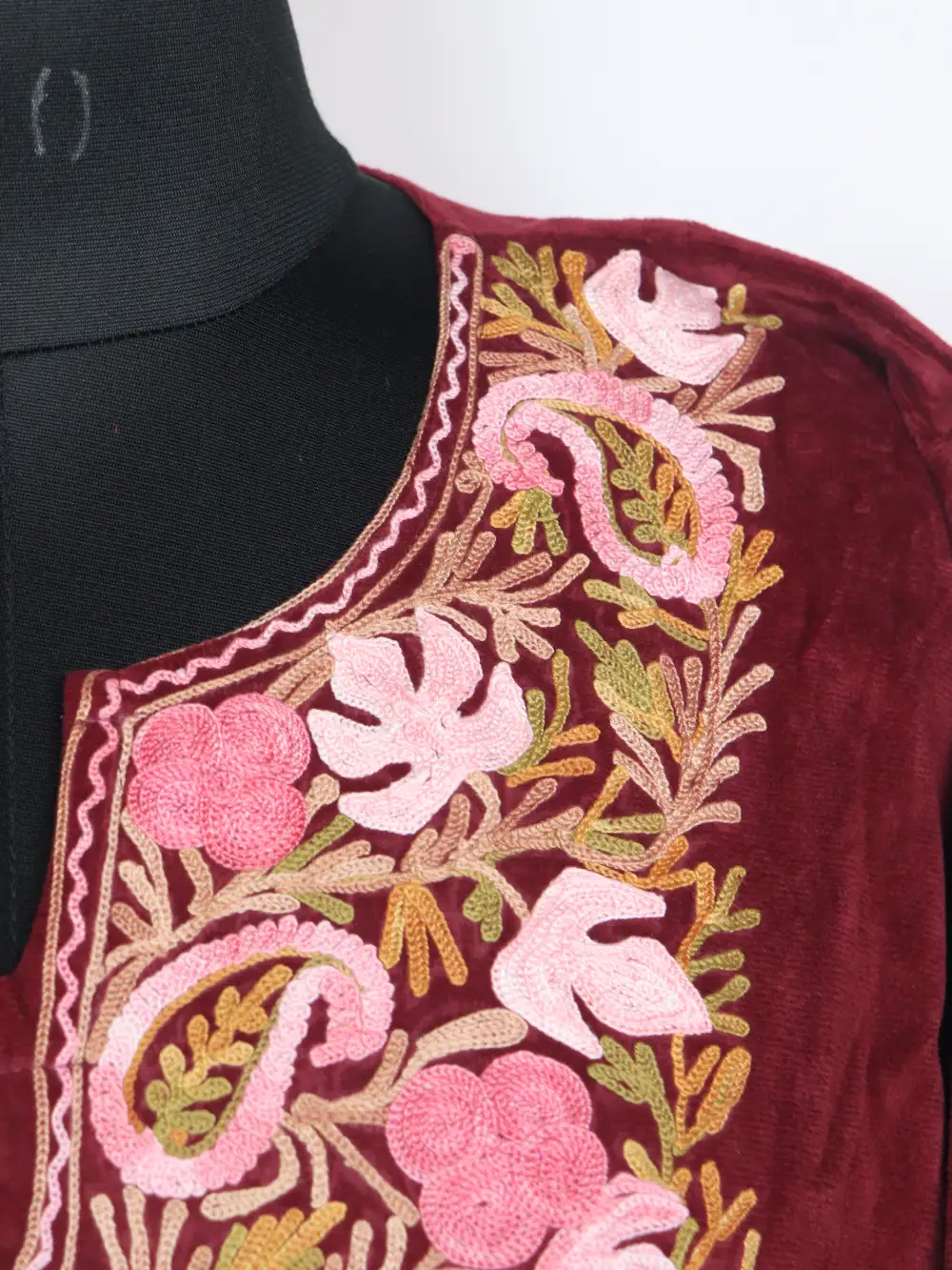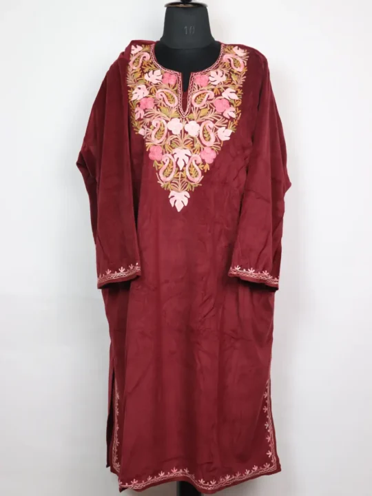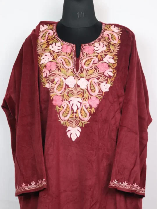 This velvet pheran offers a soft shine and a comfortable fall. Its neckline carries floral aari touches with badam and chinari embroidery and a chest 60 with 44 length gives a relaxed shape plus two side pockets.