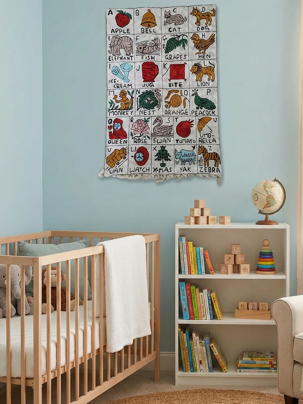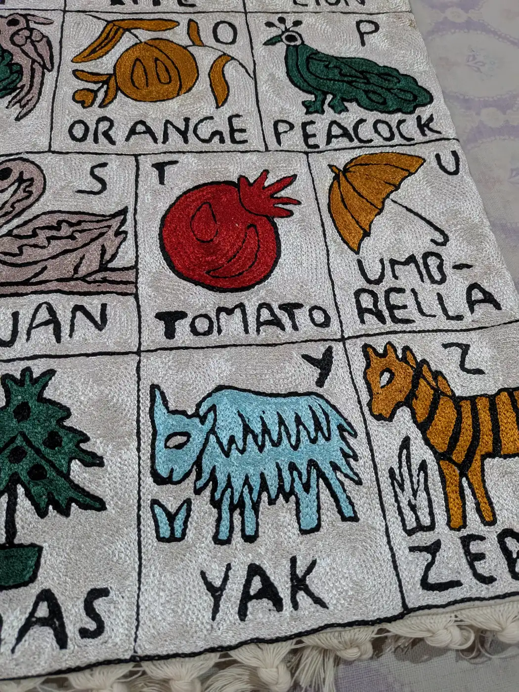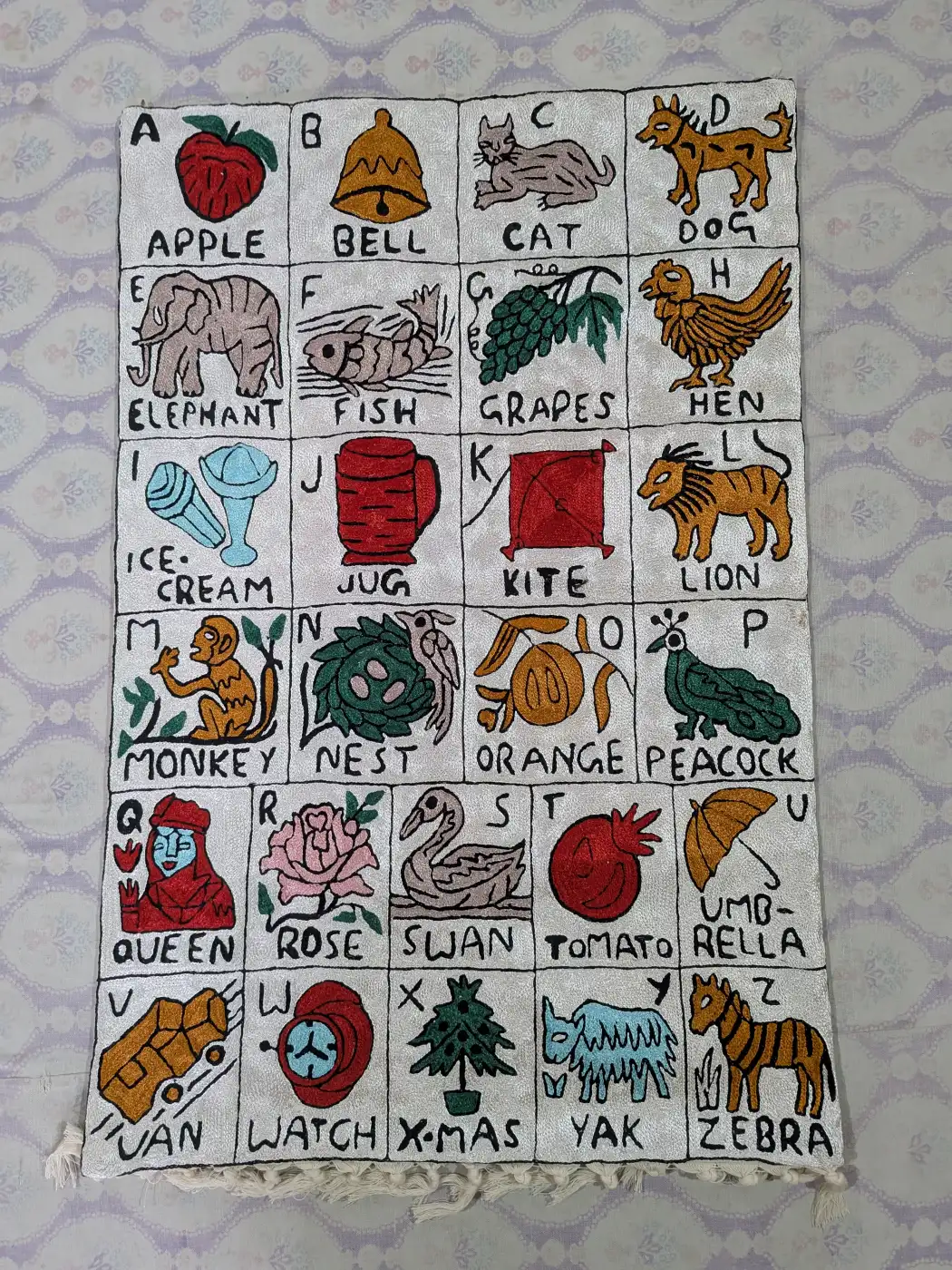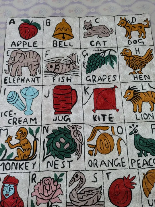 This Kashmiri wall-hanging is made on dusoot cotton with neat hand chain stitch embroidery. Sized at 3×2 feet, it features the alphabet from A to Z, which makes it both decorative and educational. Its bright motifs make it appealing for kids while holding the essence of Kashmiri embroidery. A charming way to introduce artistry into daily living.