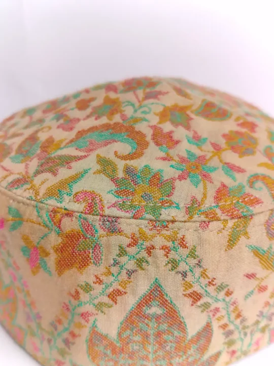 Made using woven kani shawl fabric, this Kashmiri kani cap in yellow highlights Kashmiri textile heritage. This foldable topi features floral and minimal badam embroidery blossoms on the crown while the sides display continuous chinar pattern motifs flowing around the band.