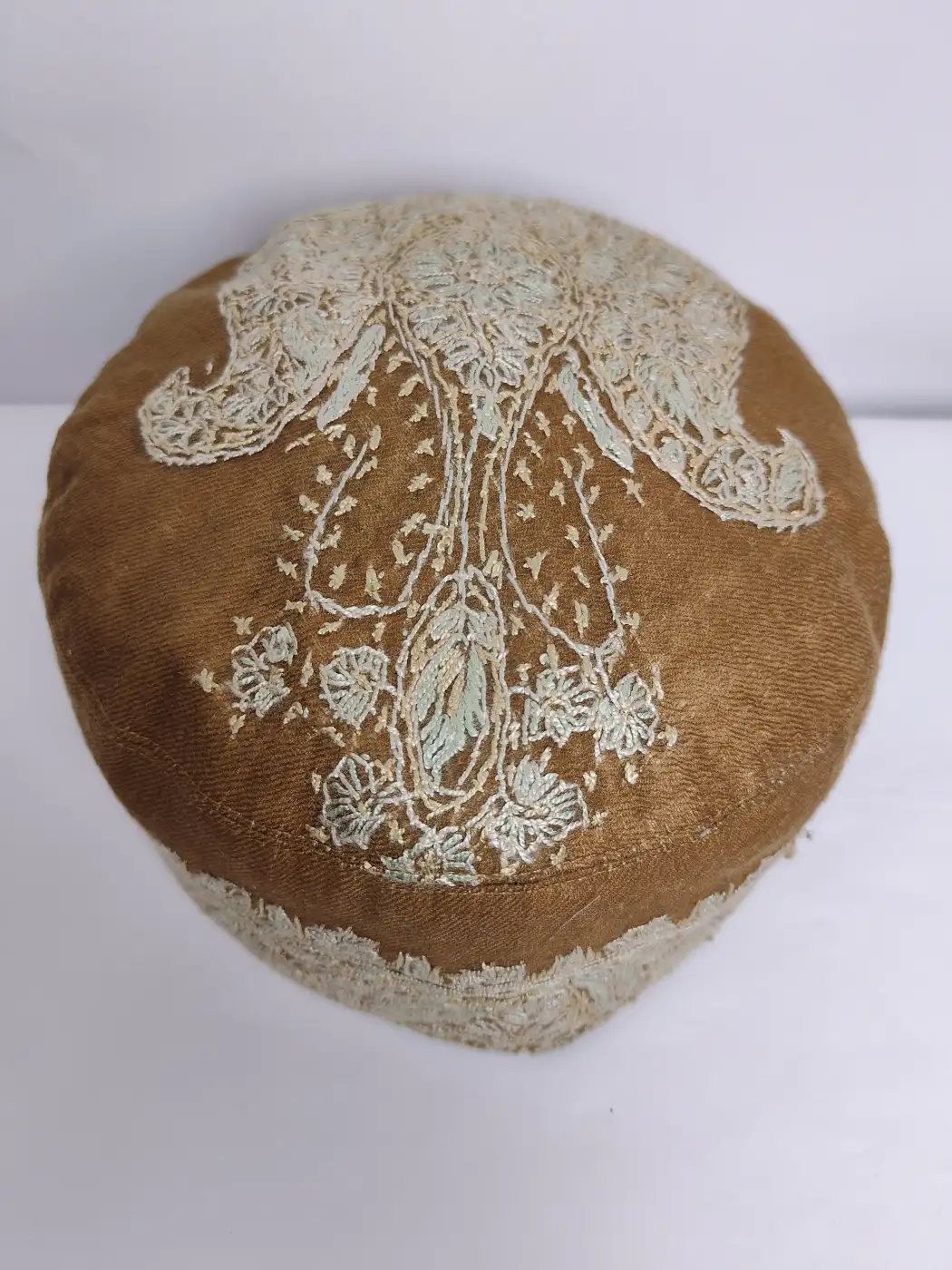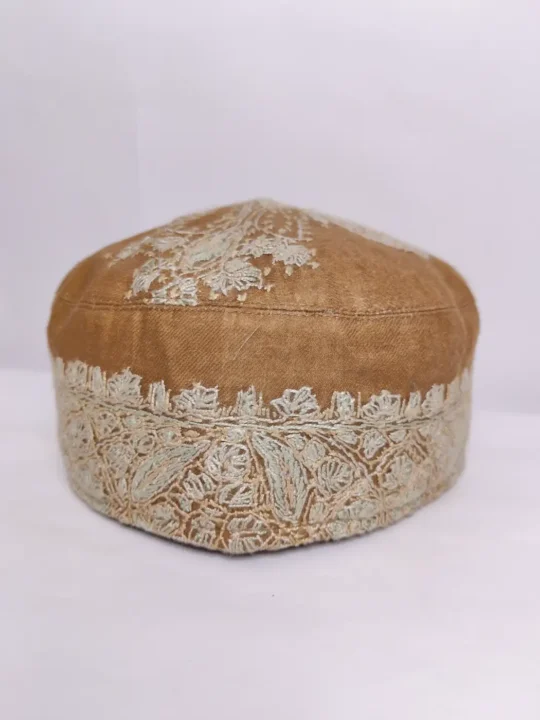 Continuous embroidery flows along the borders of this foldable Kashmiri cap while a striking badam motif crowns the top. This topi has been made from beige MP pashmina and finished with hand sozni work. It carries refined Kashmiri craftsmanship.