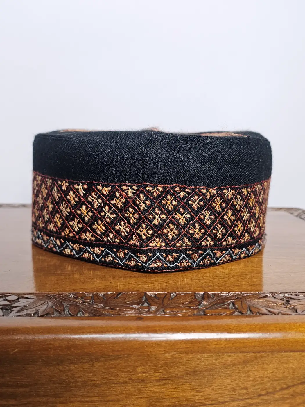 Made from premium pure pashmina, this black cap carries intricate hand Sozni embroidery — the most delicate of Kashmiri needlework. The embroidery flows in sides in geometrical patterns and the top in badami motifs with yellow and dark red threads Its luxurious texture pairs beautifully with ethnic and formal wear alike, while its traditional roots connect it deeply to Kashmiri culture. A refined accessory for men who appreciate heritage woven into every detail.
