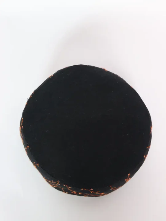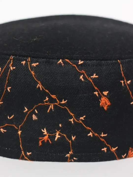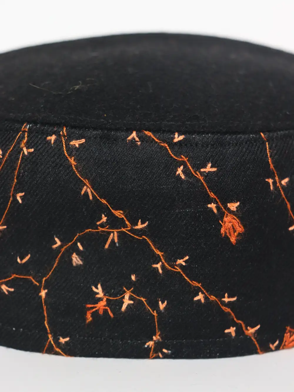 Toosha fabric creates the soft foundation of this black colour cap, it has been accented with hand sozni embroidery arranged as a simple border in continuous patterns.