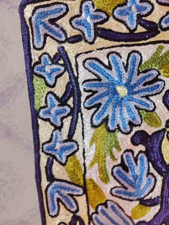 Prepared in dusoot cotton for elegant homes, It carries Kashmiri hand chain stitch embroidery formed with silk threads into flowers. It beautifies seating, offers comfort, saves cushions, and spreads warmth, culture, and handmade beauty.