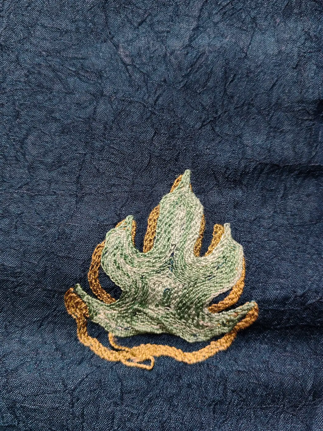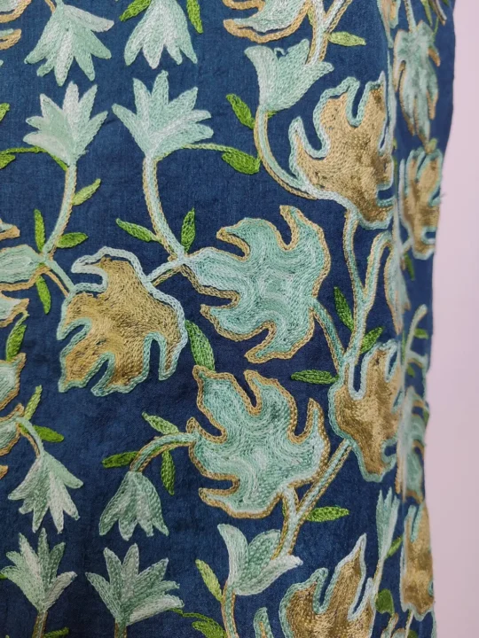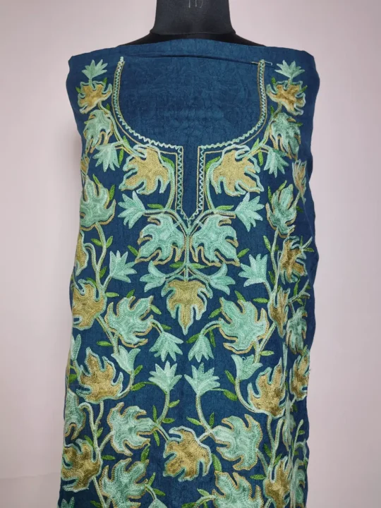 This Kashmiri work suit is covered in detailed chinari embroidery, gives the blue fabric a complete appearance. Crafted in crush cotton with aari work, it comes as an unstitched kameez and salwar, offers both ease and a touch of traditional artistry.