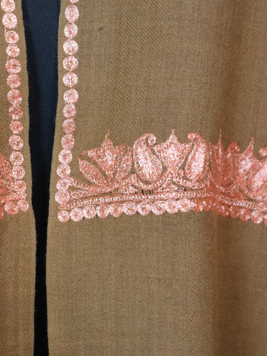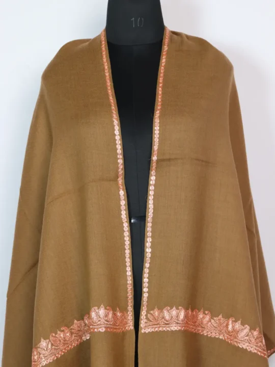 Bottle Tilla runs continuously around the border of this Pure Wool Stole in golden-hued threads, which gives this the piece a formal Kashmiri glow. This brown Stole is made for women who prefer elegant layers and delicate sheen.