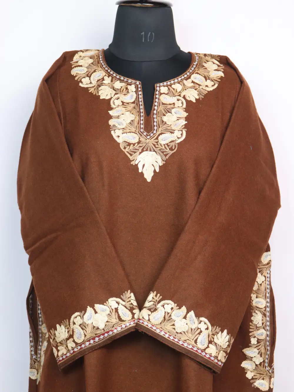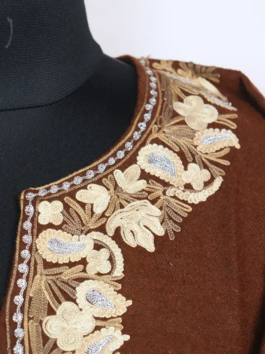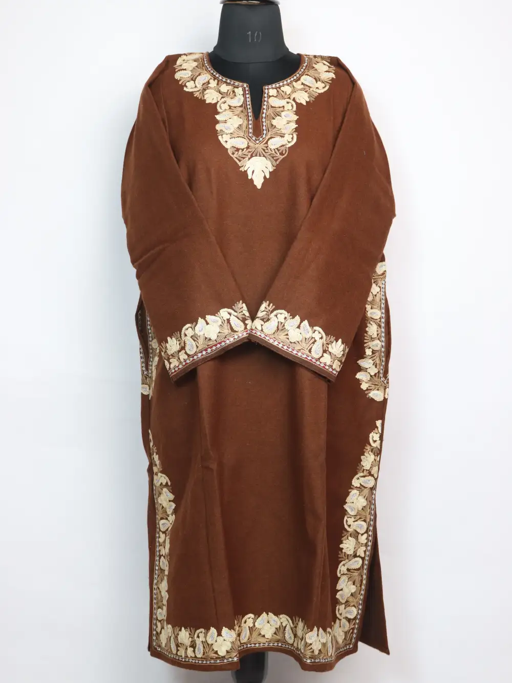 The soft tweed wool in a calm brown colour shapes this stylish Kashmiri pheran with Aari and Zari around the sleeves and border and neckline in badam and chinar patterns which adds refined shine. Its chest size 49 and length 44 gives it a roomy fall.