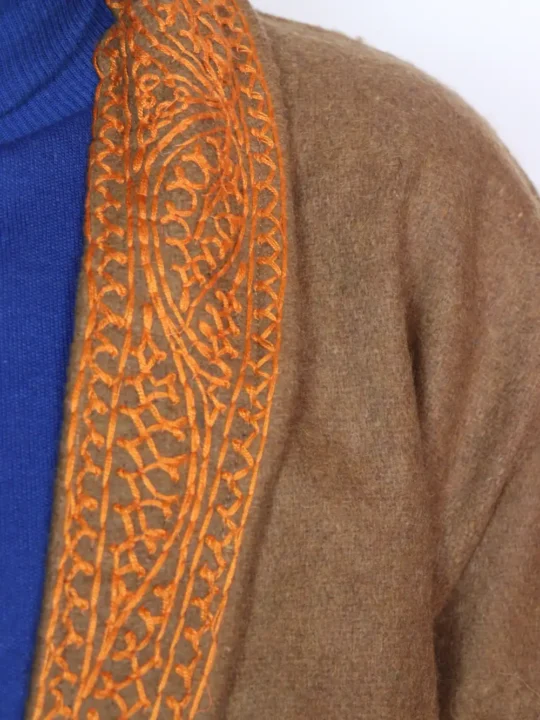 This brown gown is a timeless piece. It features stunning Aari embroidery. It is perfect for winter wear, and it combines traditional elegance with contemporary style. Its soft fabric ensures warmth and comfort, making it an essential winter garment.