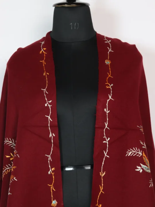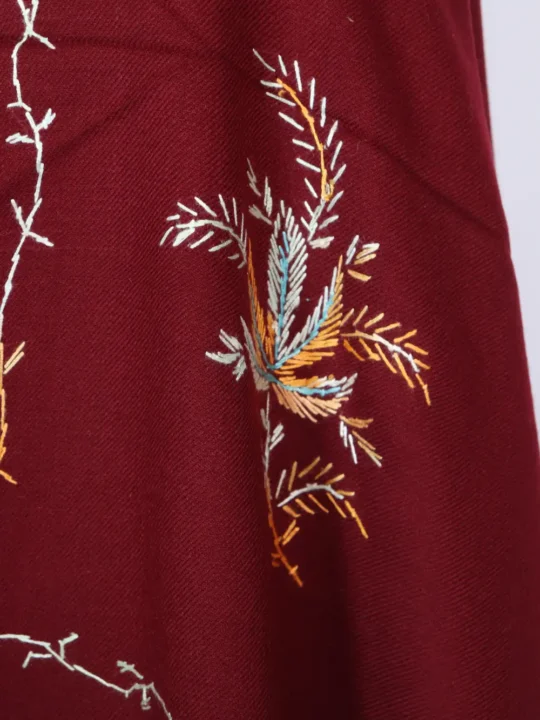 Cashmilon Wool and careful Hand Sozni kaam make this maroon Kashmiri Shawl a polished accessory, its border has been stitched continuously and each corner of this shawl has been decorated set with chinar inspired huge floral motifs by using white and orange hue threads. This shawl adds measured ornament to formal wear while remaining comfortably wearable for events.
