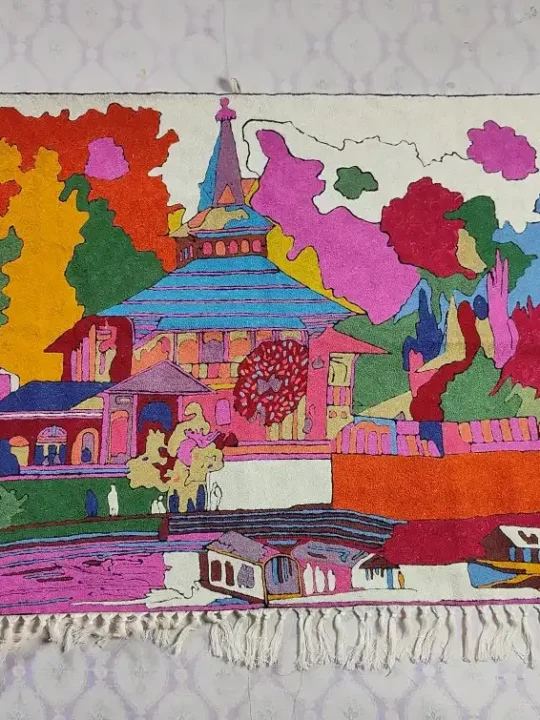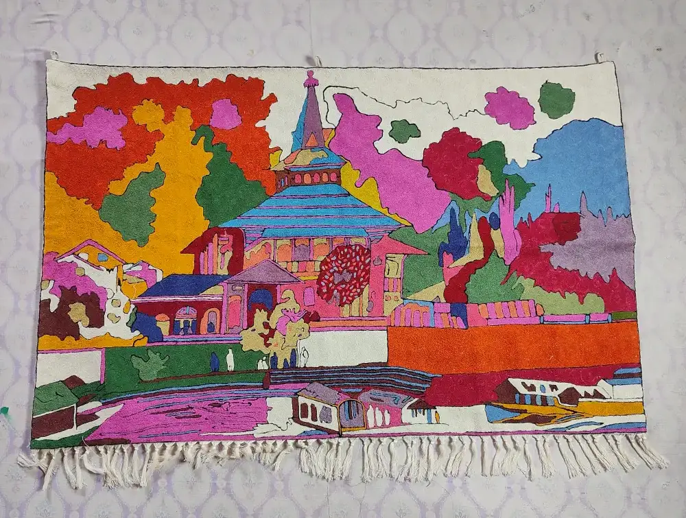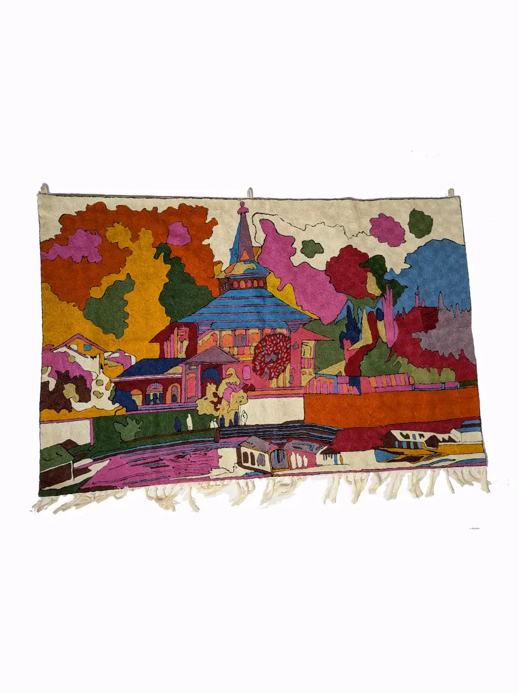 Sized at 4×3 ft, this Jama Masjid inspired wall-hanging is a traditional Kashmiri piece for your walls. It has been embroidered in chain stitch, using multi-color threads like red, pink, blue etc. that highlight each design beautifully across the cotton base. The wall-hanging features pink shaded building (shrine) with blue roof and tall spire or tower like in center. It also features pathways which lead to buildings, the background is filled with abstract shapes of trees and hills. Light in weight yet full of cultural character, this wall piece is both practical and artistic. It is a wonderful addition to homes where tradition is treasured.