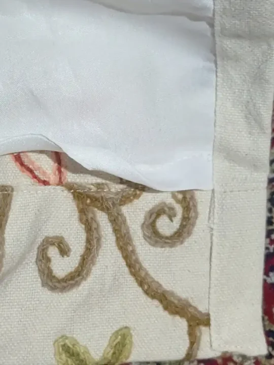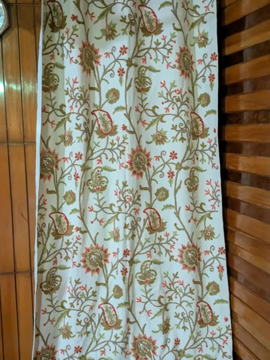 The design features elegant vine and badaam patterns that feel both rooted and refreshing. With inner lining , it offers a neat, flowy fall that frames your space beautifully. Made in breathable dusoot cotton and brought to life with wool thread embroidery, this curtain carries delicate vine patterns drawn by hand . The crewel work reflects the patience and skill of Kashmiri artisans