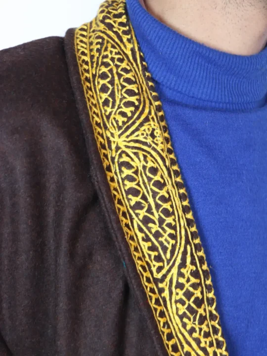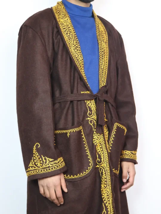 This dark brown colour winter gown for men comes in tweed for a steady Kashmiri drape, elevated by Aari embroidery. It includes chest size 46 inches and length 49 inches, giving structured room and a classic winter presence.