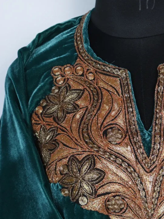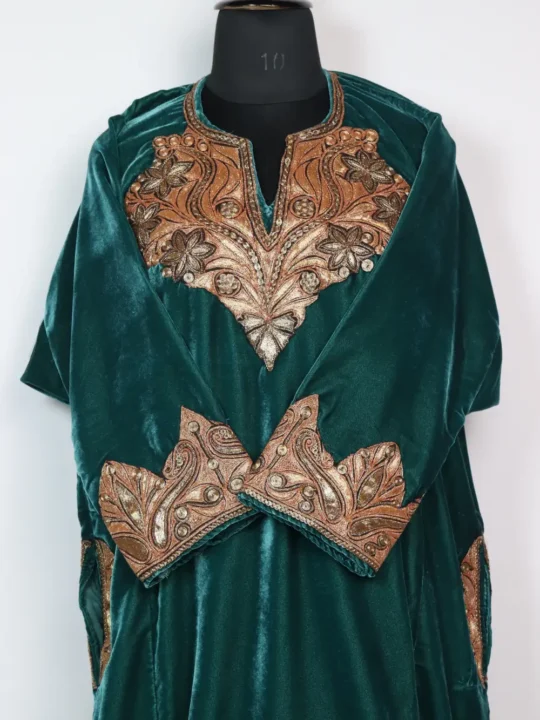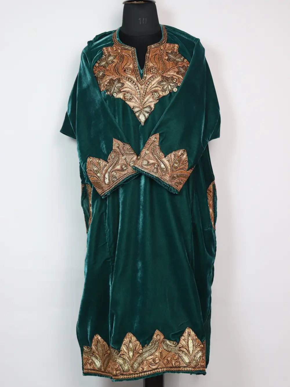 A Velvet phiran dress in dark green features Bottle Tilla embroidery at the neckline, borders and sleeves in floral patterns and it has pockets both side for handy use.