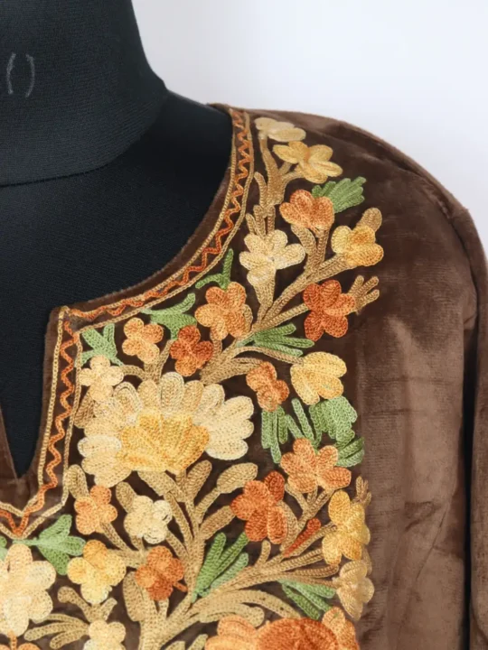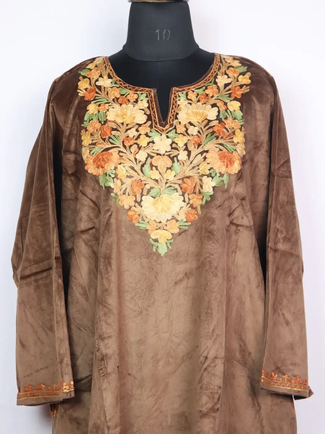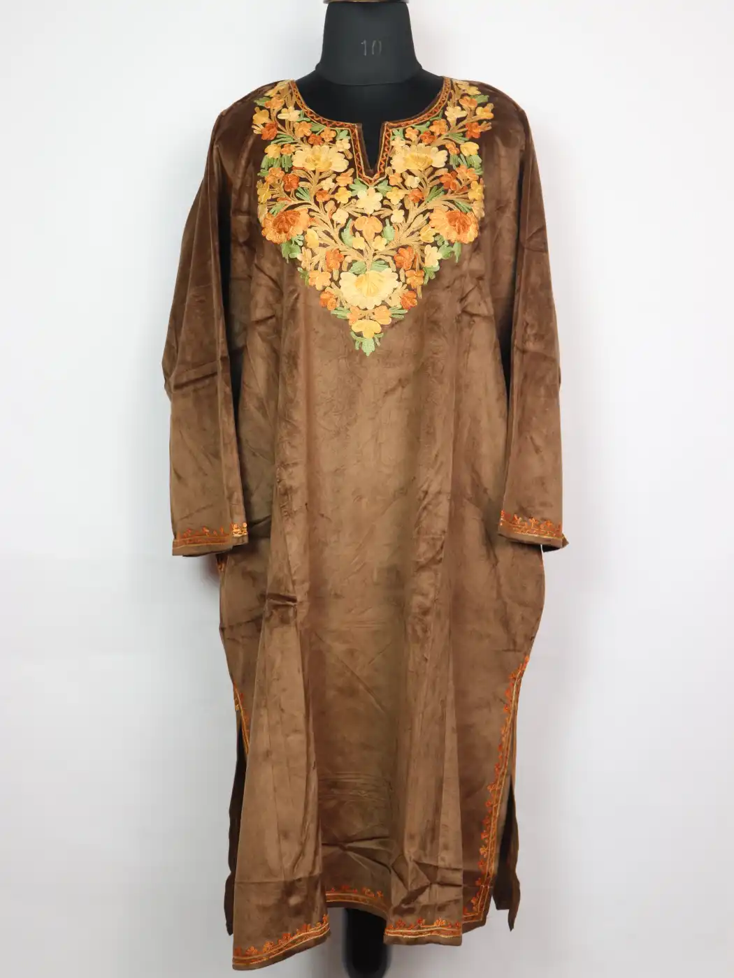 This velvet pheran brings simple comfort with a touch of style. The neckline has beatiful coloful floral aari kadhai, and chest 60 with length 44 offers free movement with two side pockets. It sits well on the body without feeling tight. Ideal for everyday use.