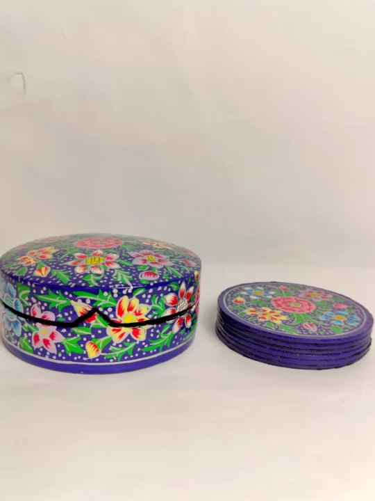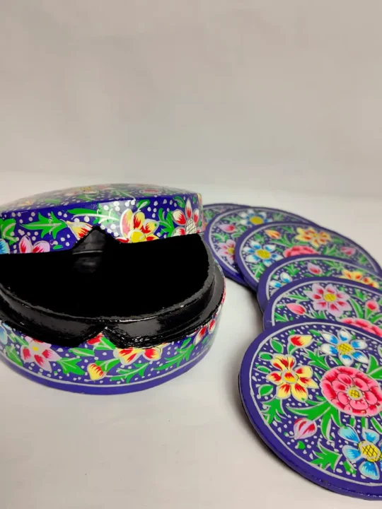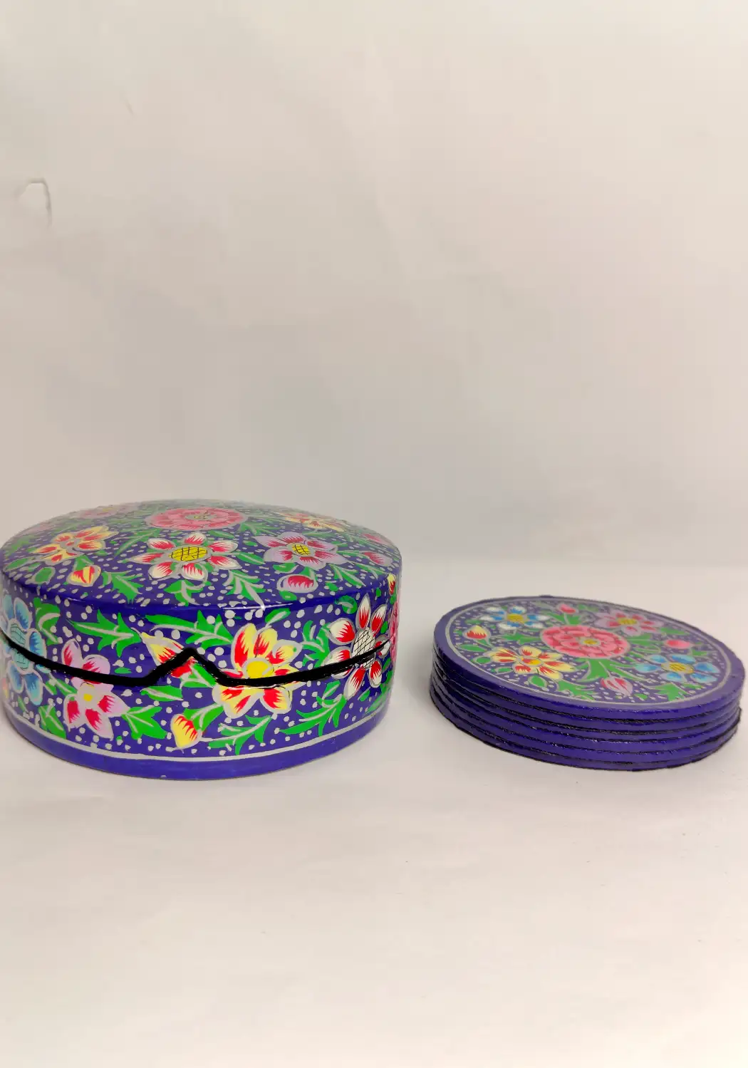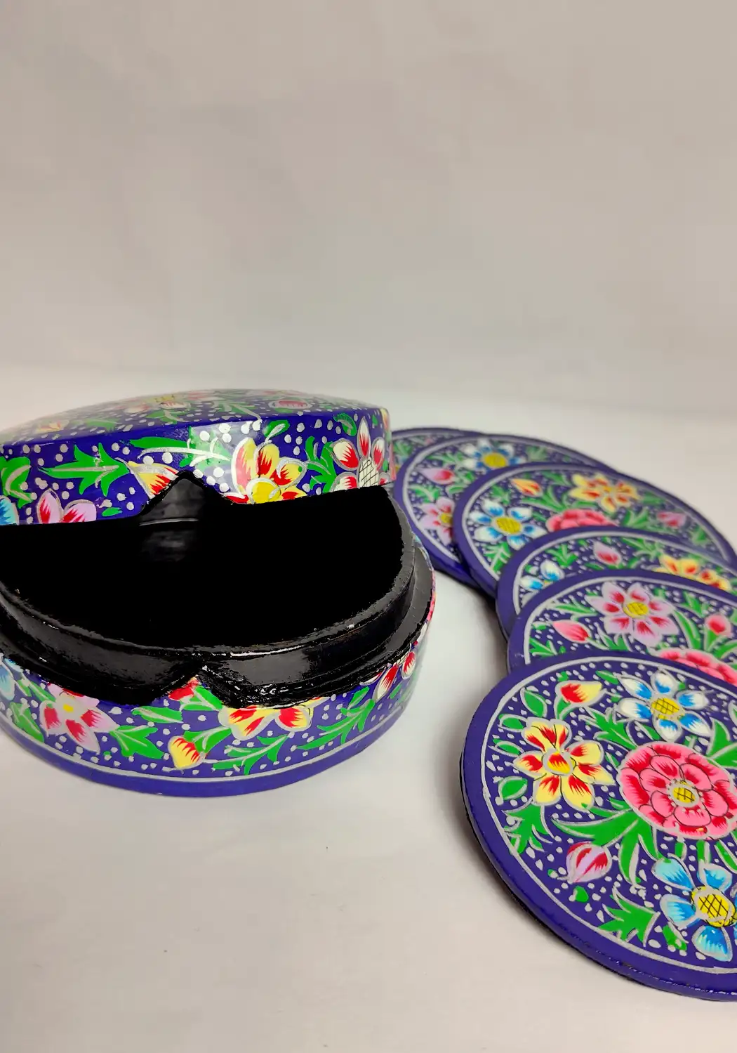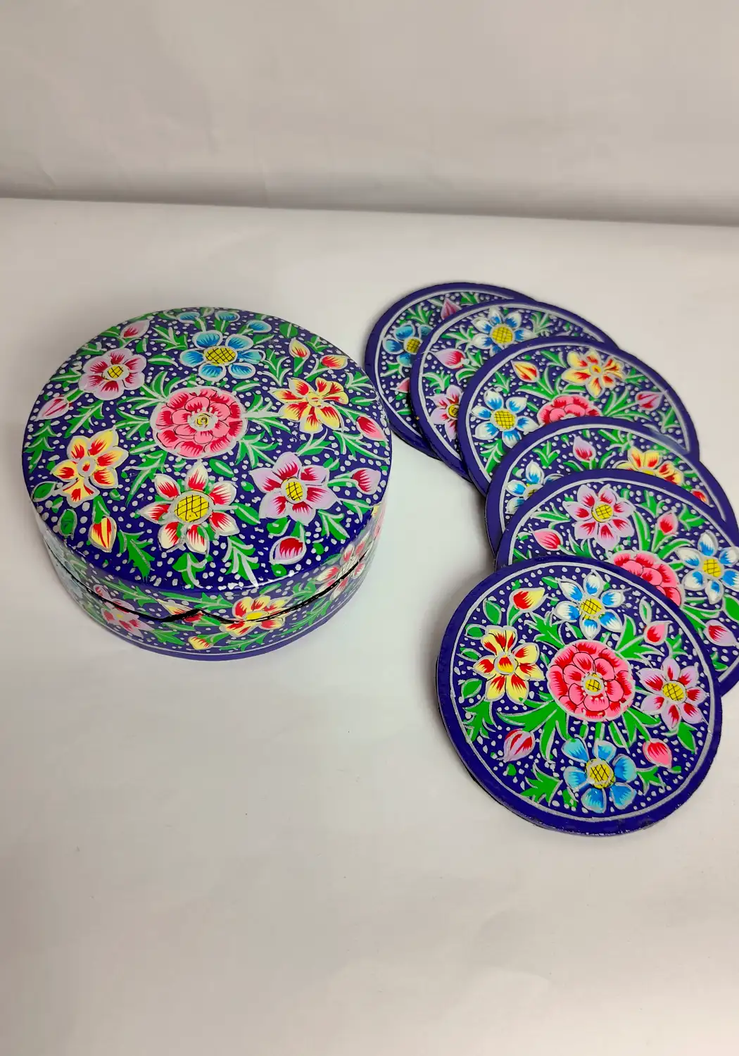Multi-colour floral paper machie embroidery gives this coaster set its distinct charm. With six round coasters placed inside the box, this set feels complete and perfectly functonal for any set of glasses or cups. It is thoughtfully made, adding a quiet traditional without being too heavy or overwhelming.