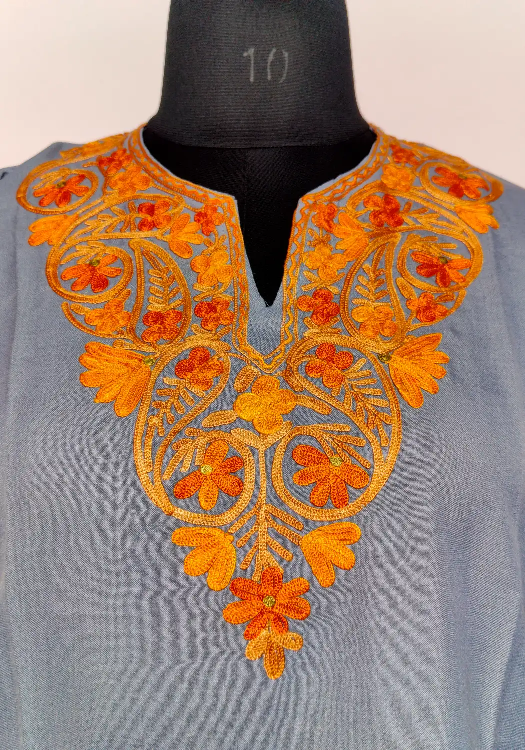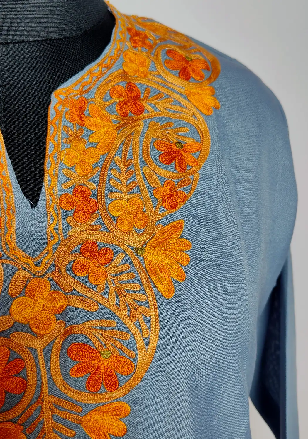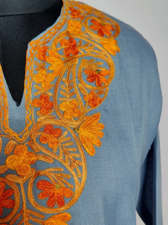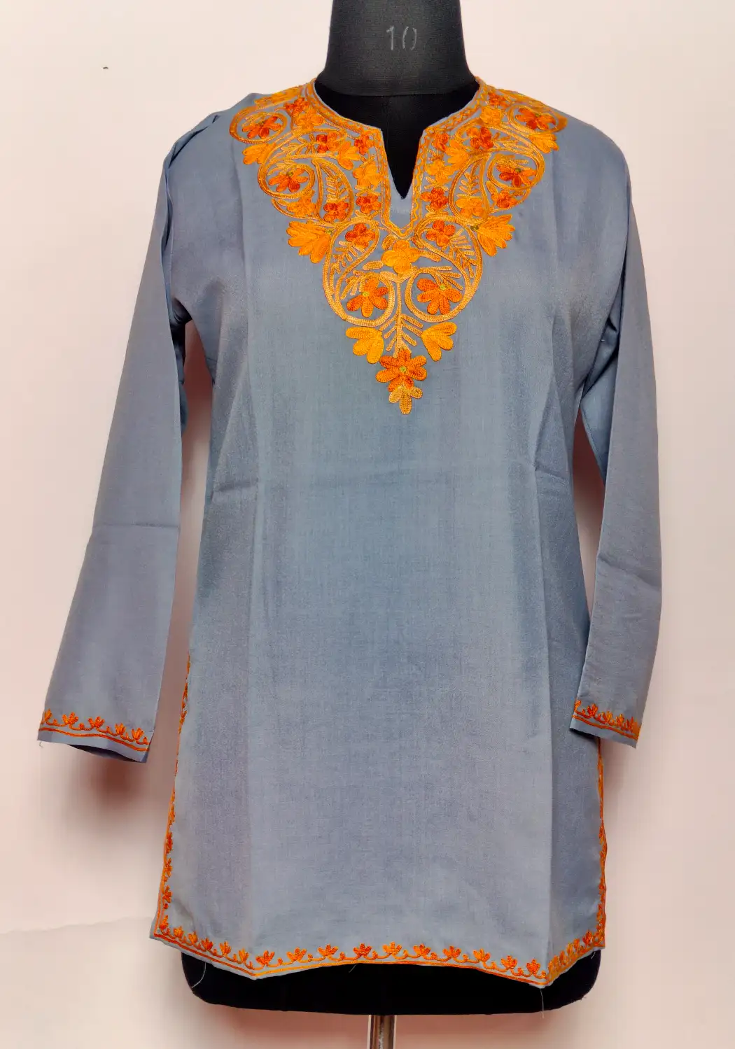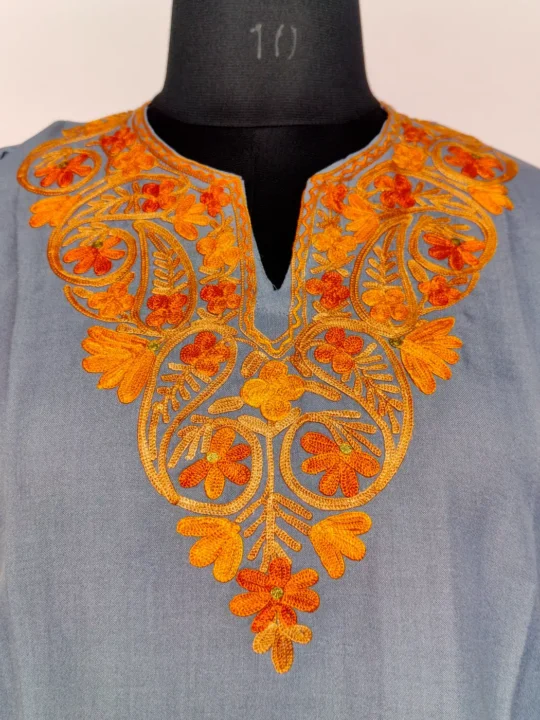 Floral badam aari embroidery softly highlights the neckline of this grey kurti, which gives it a gentle focal point. Made in summer cool cotton, it feels light and breathable. This aari brand kurti piece carries an easy everyday charm with a subtle Kashmiri touch.