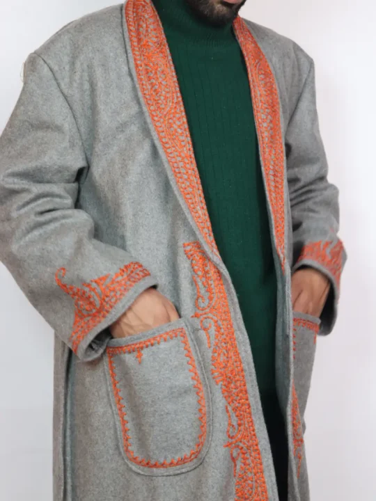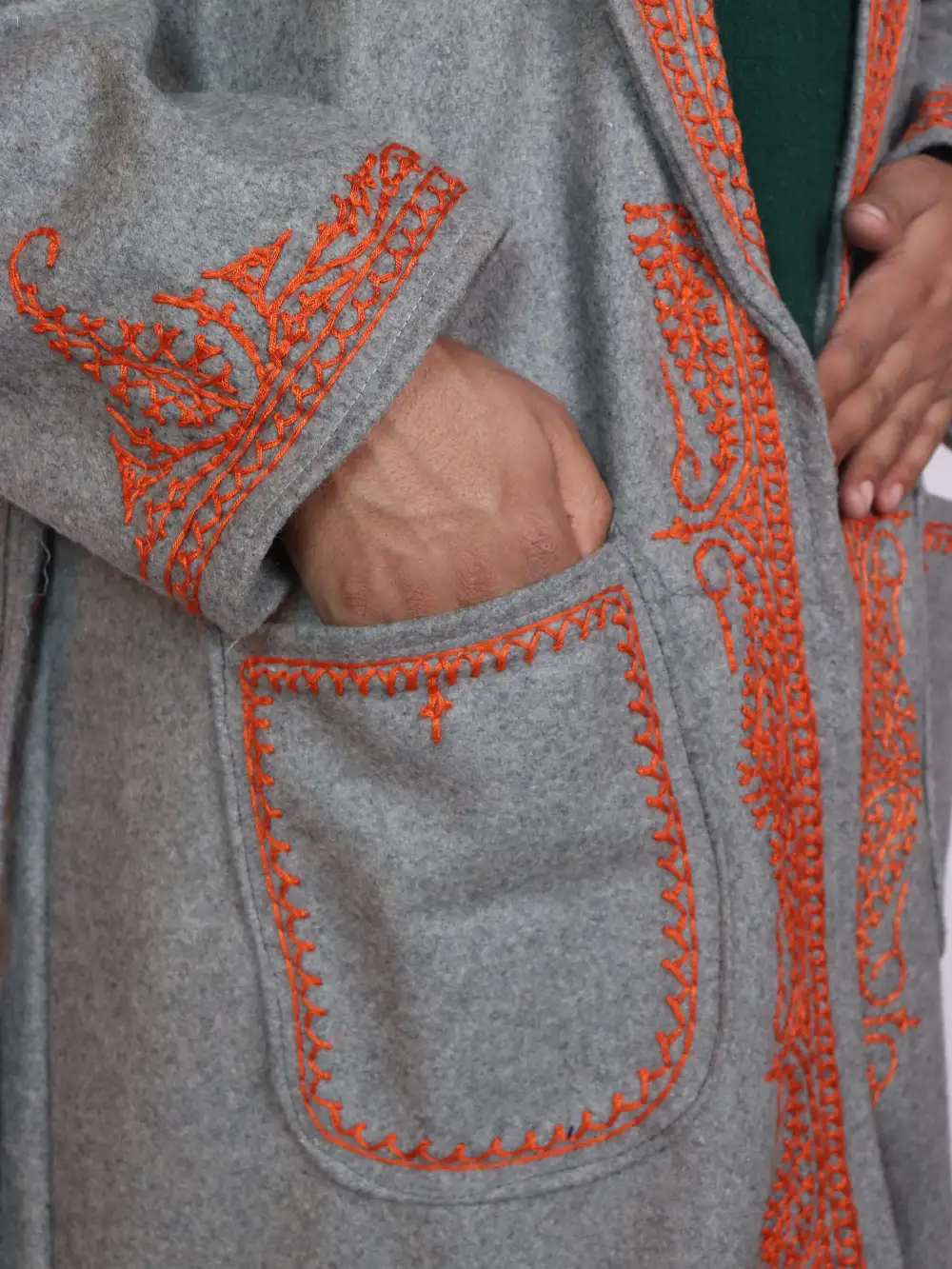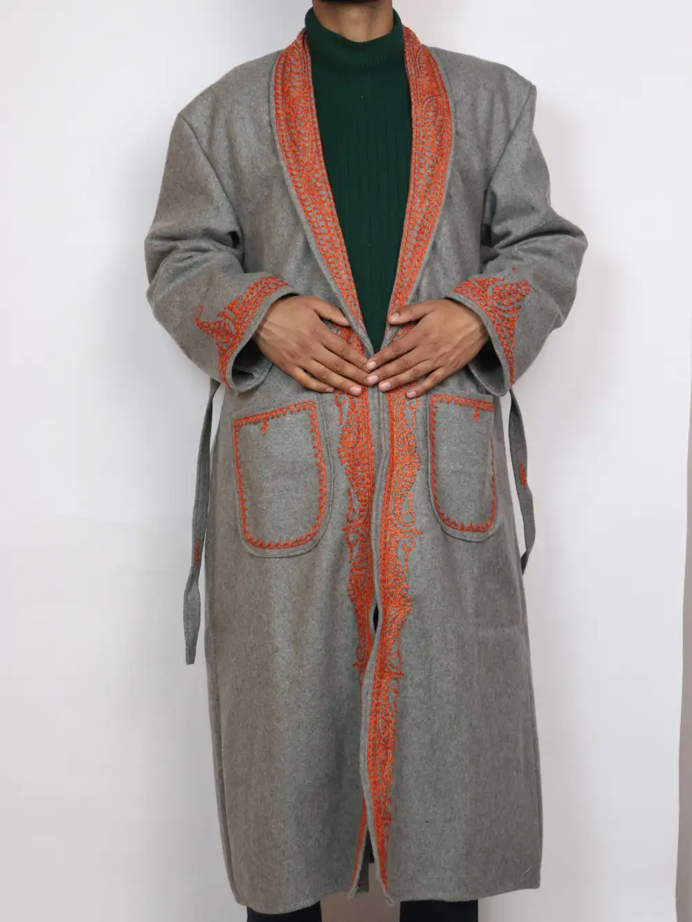 A grey coloured Kashmiri embroidery gown in tweed wool carries hand Aari embroidered in floral motifs at front side collar, two side pockets and sleeves and it includes belt for customized fit.