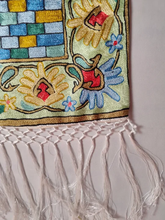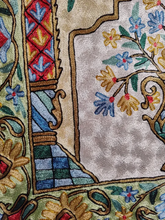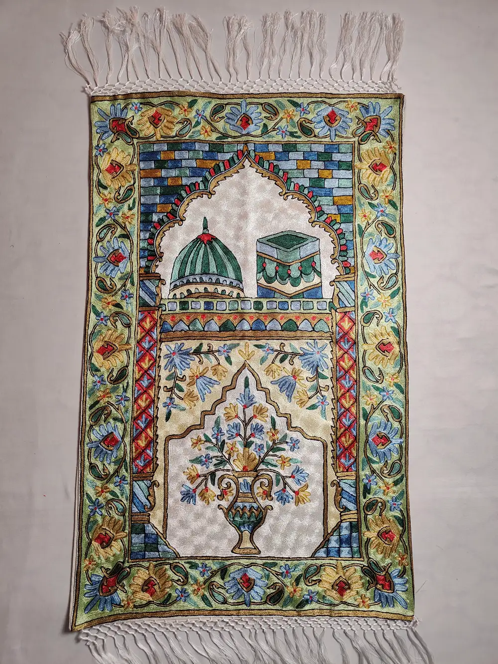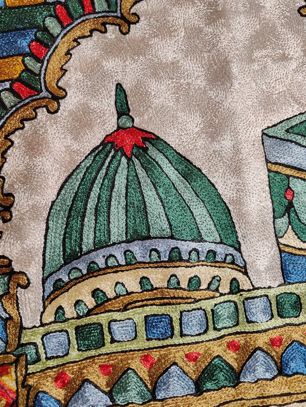 This Kashmiri prayer mat is crafted in dusoot cotton and measures 3.5 * 2.25 feet. With hand chain stitch embroidery, it features Makkah and madina’s Kaba and Masjid Nabawi on the upper panel and floral motifs spread across the lower. A sacred and elegant piece that carries Kashmiri artistry, bringing beauty and devotion together in one mat.