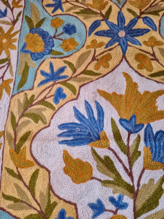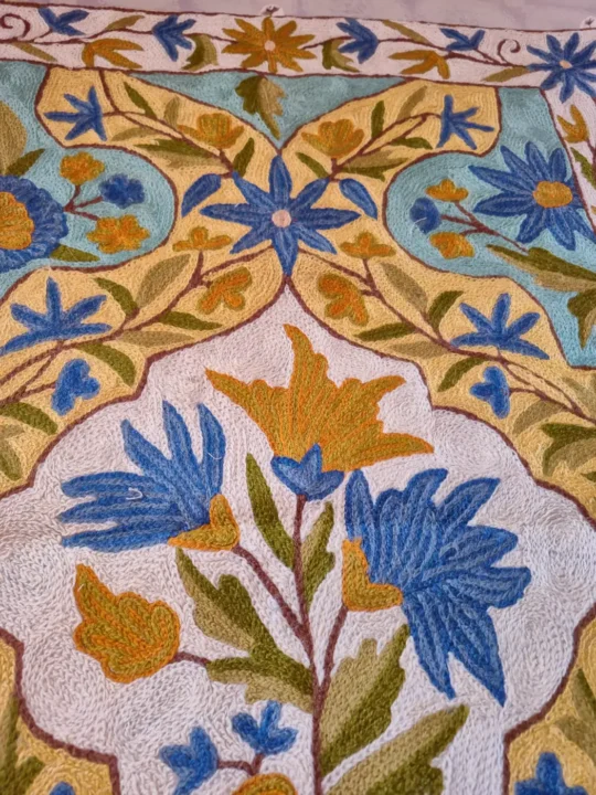 Made in Dusoot cotton for décor lovers, this wall hanging features Kashmiri hand chain stitch embroidery sewn with wool threads. Designed with a graceful flowers inside geometrical design full of lively blooms, this wall hanging brings freshness and charm to your space. It is perfect for brightening living rooms, bedrooms, or cozy corners, and perfect for homes that love a touch of nature indoors.