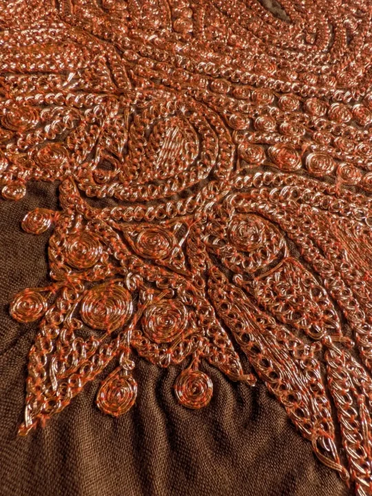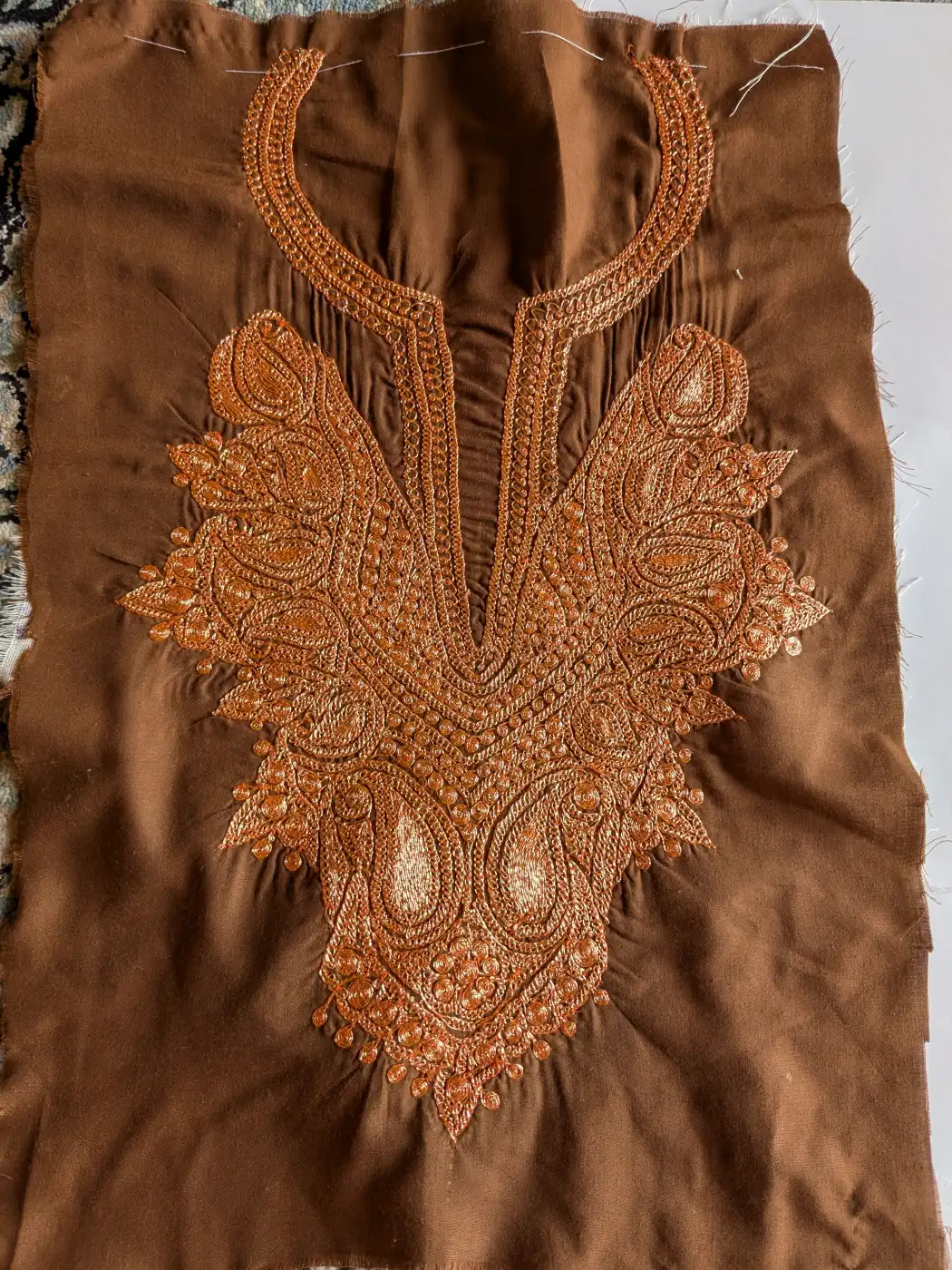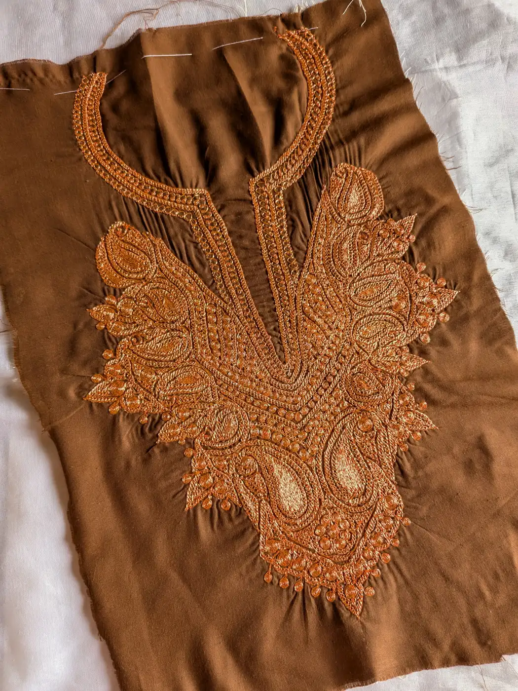 This hand tilla patch features intricate tilla embroidery in golden thread, forming a symmetrical neckline design of paisleys, florals, and fine detailing. Set against rich brown fabric, it’s designed to elevate kurtas, pherans, trousseau wear, or couture ensembles with heirloom elegance. Each stitch of this hand-tilla patch reflects the precision and legacy of traditional handwork.