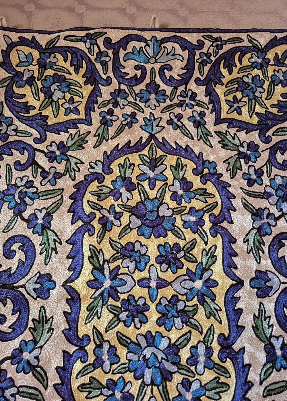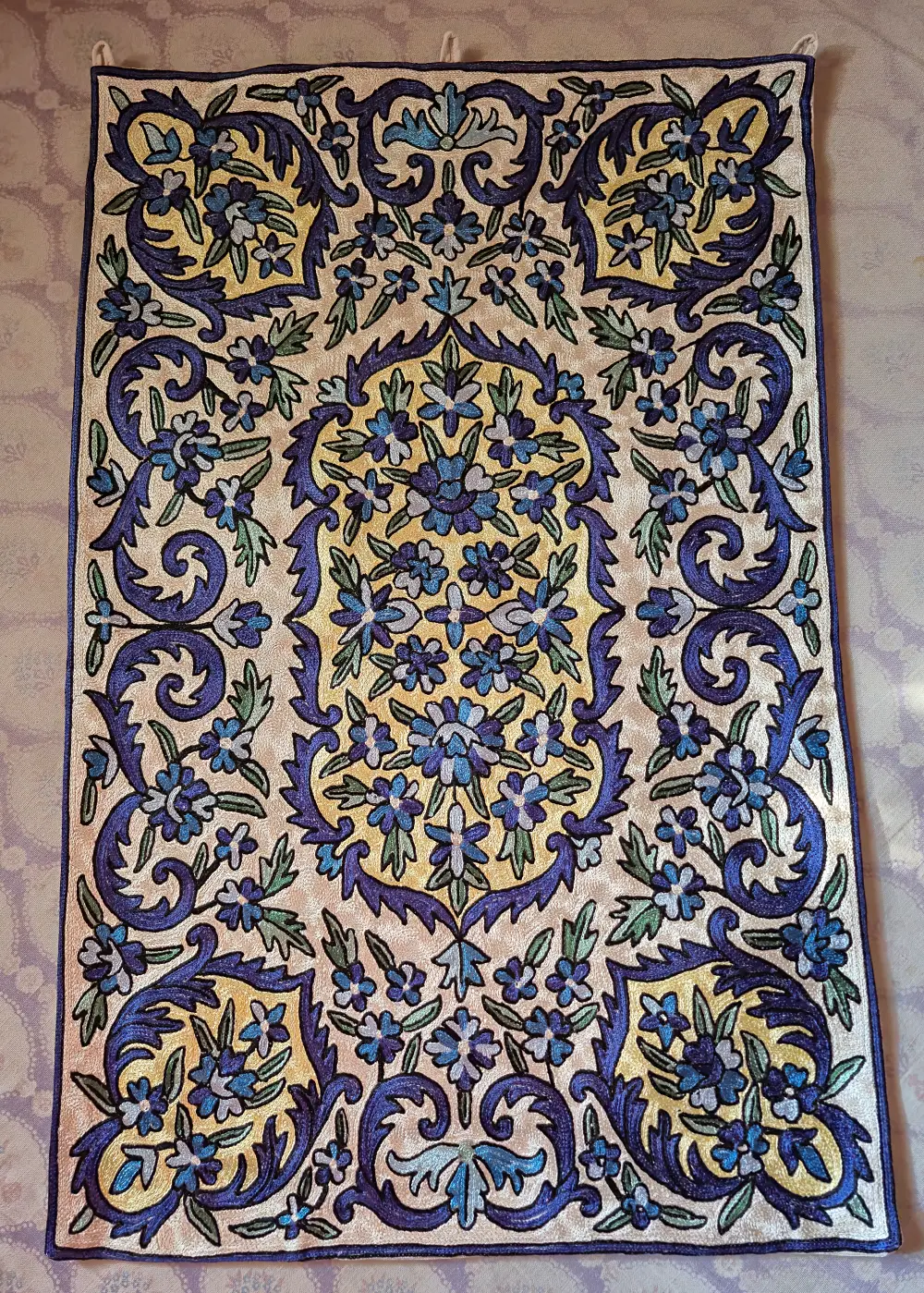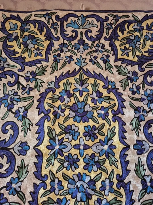 This Kashmiri wall hanging is beautifully hand stitched on dusoot cotton fabric using fine silk thread, giving it a pleasant shine and a rich look. The detailed floral pattern is carefully filled with detailed chain stitch work, showing the skill and patience of the artisan. Shades of blue and green stand out nicely on the white base, making the design look elegant and eye-catching. The work is dense, clean and evenly done, with every curve and flower clearly defined by hand. It comes with loops on the top so it can be easily hung on a wall, making it a perfect piece to decorate any room and add a touch of traditional Kashmiri craft to your home.