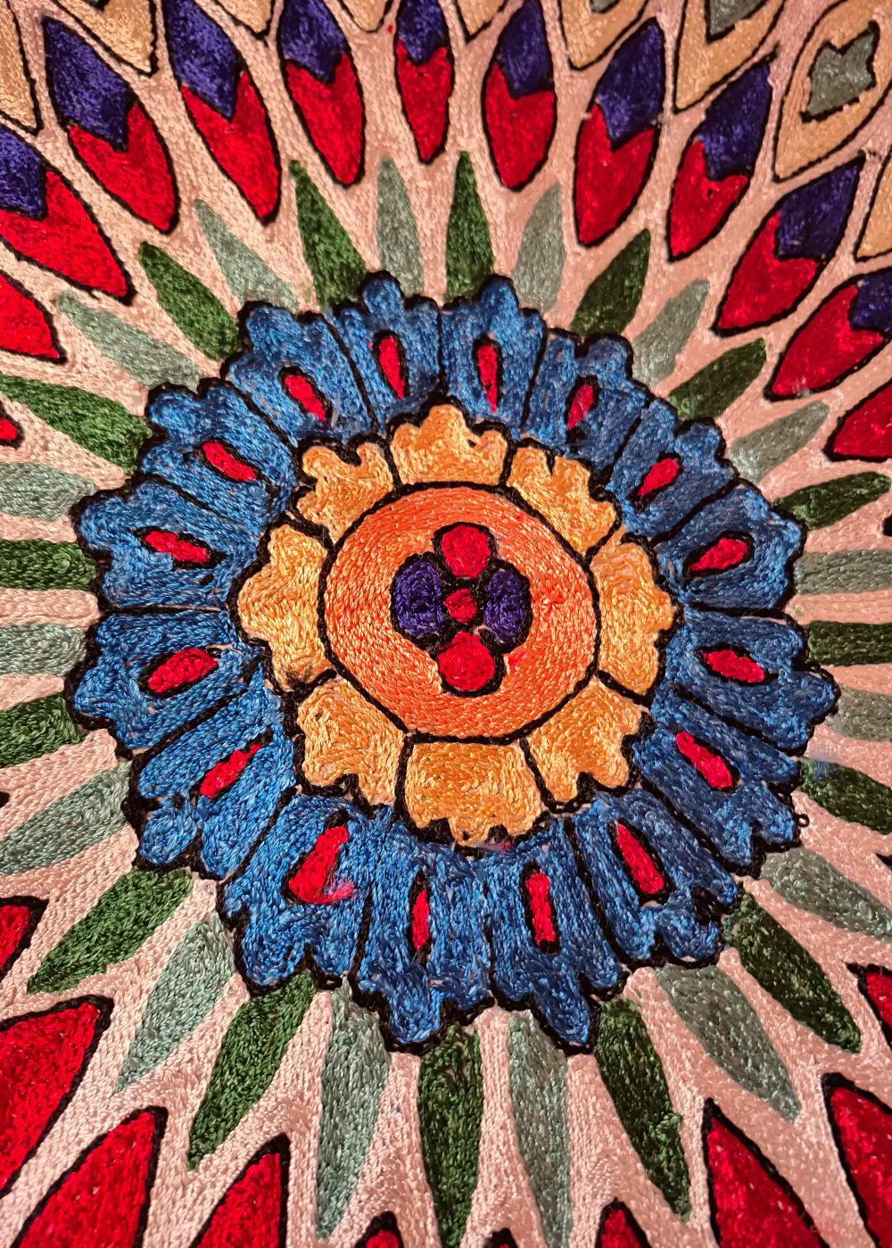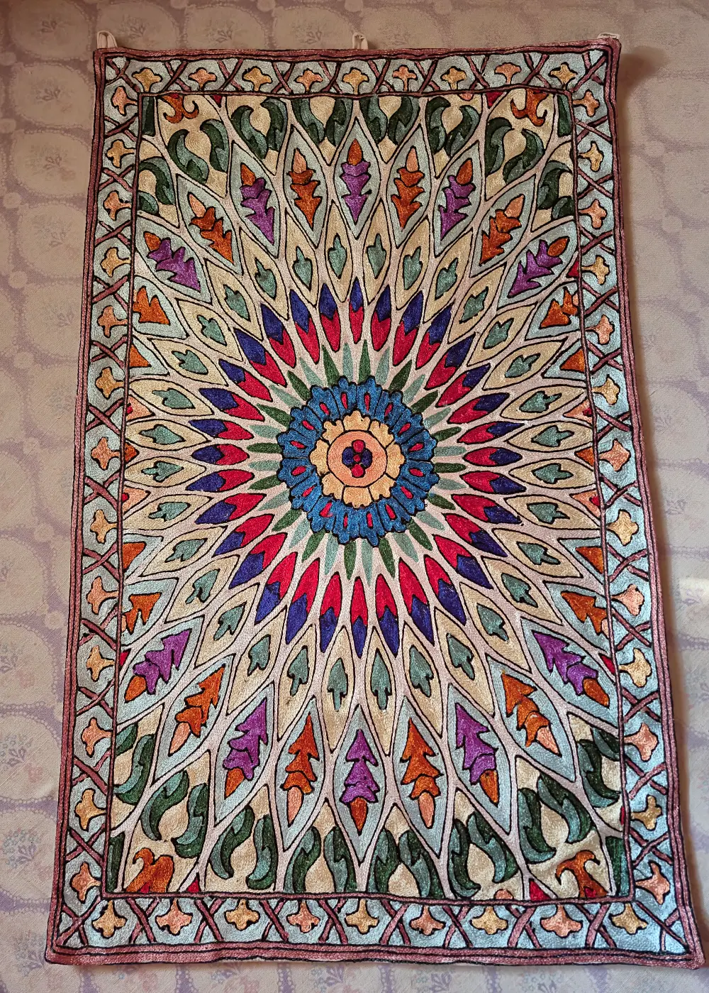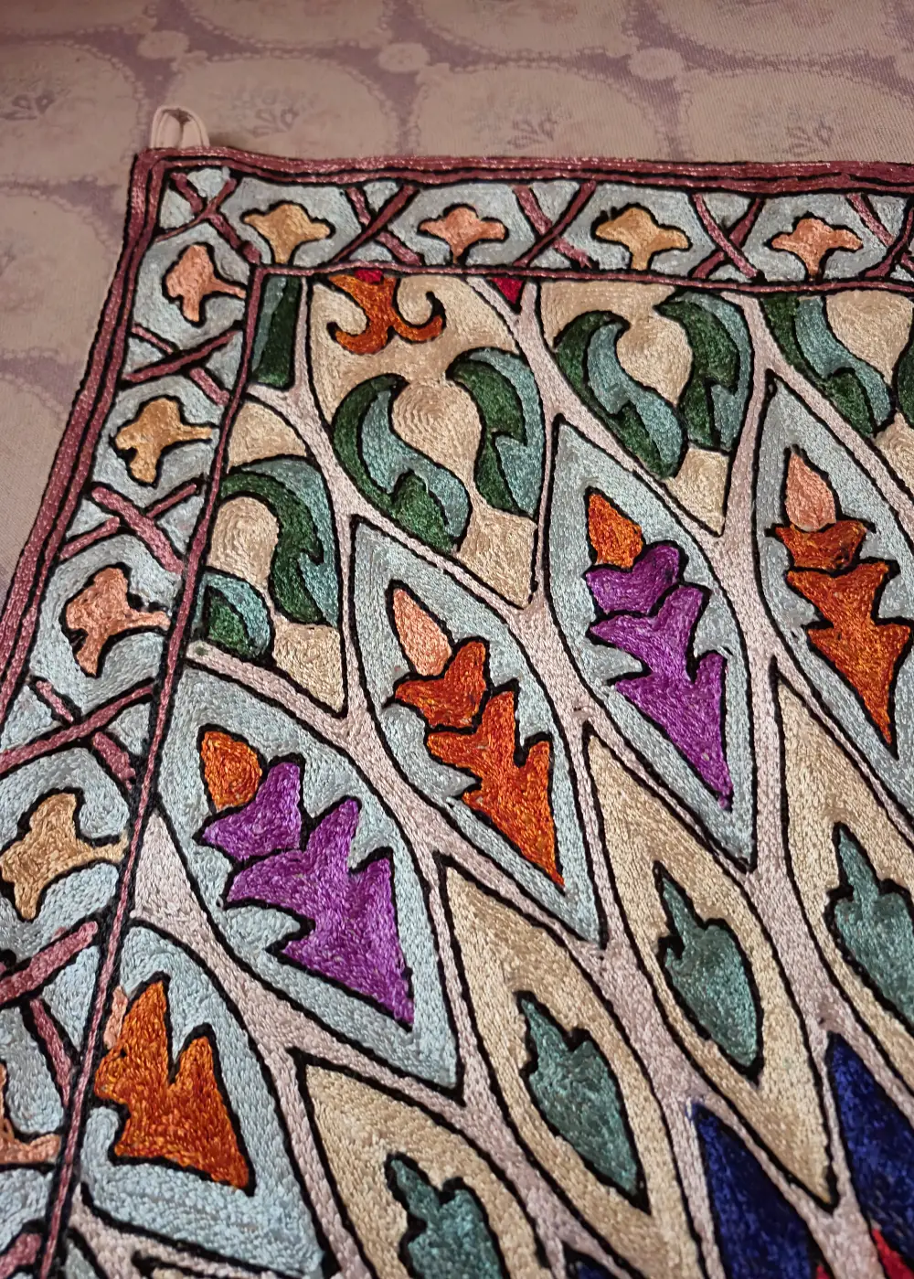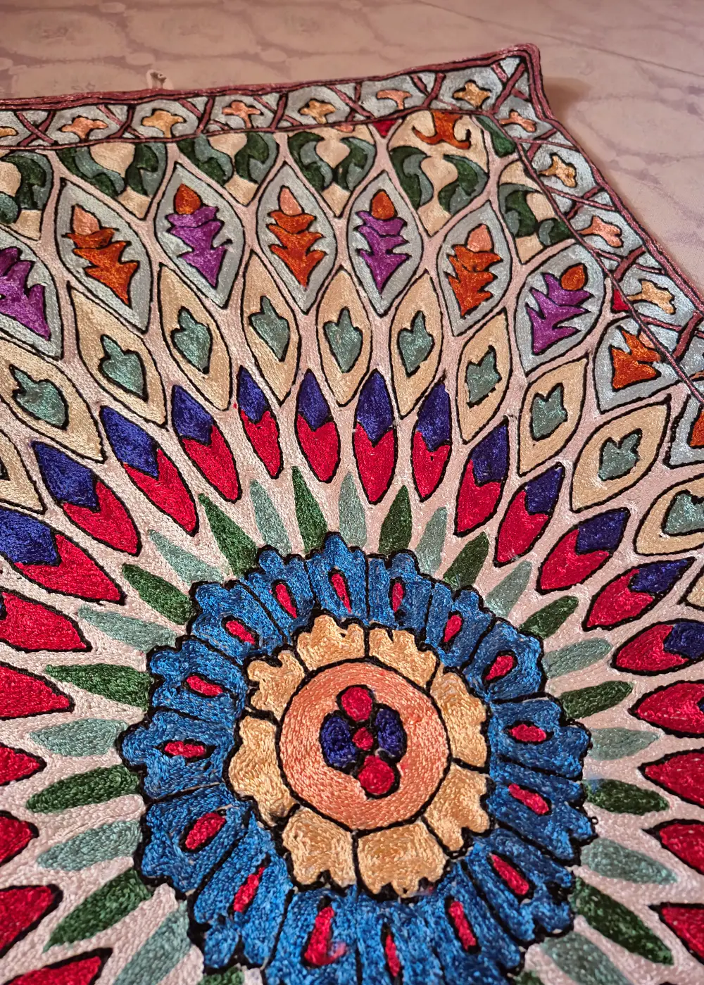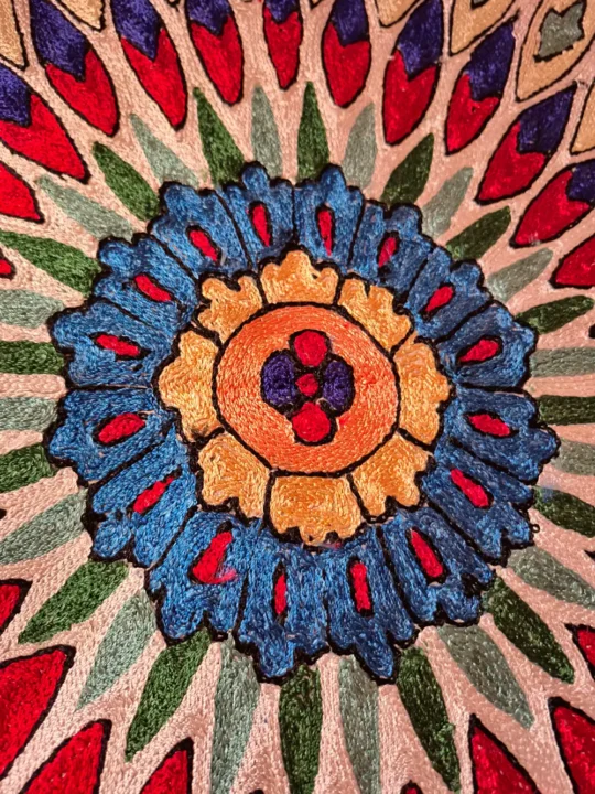 This Kashmiri hand-stitched wall hanging is made on dusoot cotton fabric and beautifully detailed with fine silk thread work. The design has a round center with leaf and floral patterns spreading evenly all around, giving it a rich and classy look. The neat hand stitching, detailed outlines, and smooth silk thread shine make the patterns stand out clearly and add depth to every part of the piece. The borders are also carefully filled with small detailed motifs that complete the overall design. It looks elegant and eye-catching when placed on a wall and adds a traditional Kashmiri touch to any room, making it a perfect decorative wall hanging for home interiors.