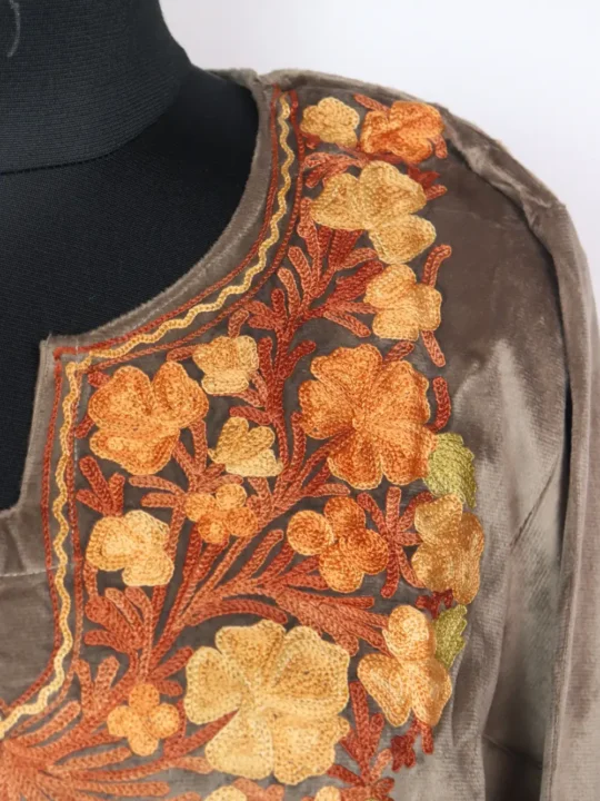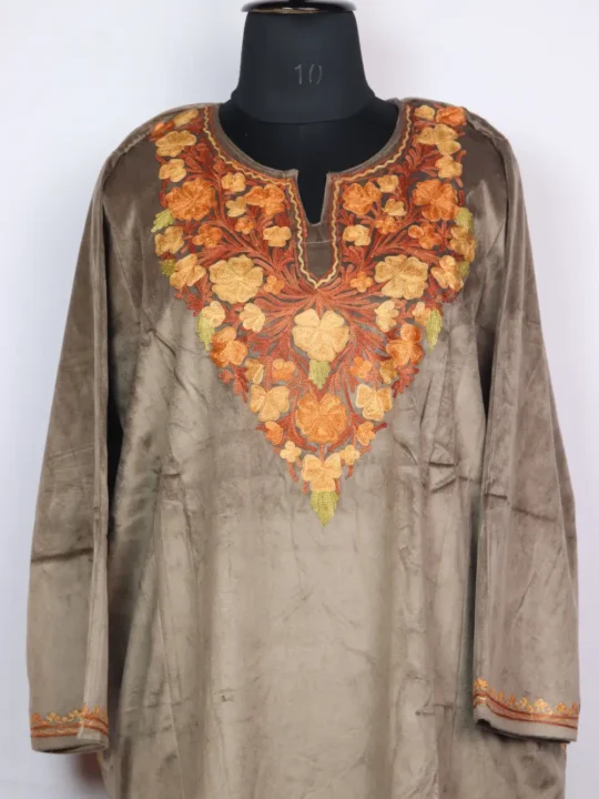 Crafted in velvet, this pheran stays soft on the skin and easy to wear. Its neckline holds floral aari work, and the 60 chest and 45 length which give it a comfortable look.